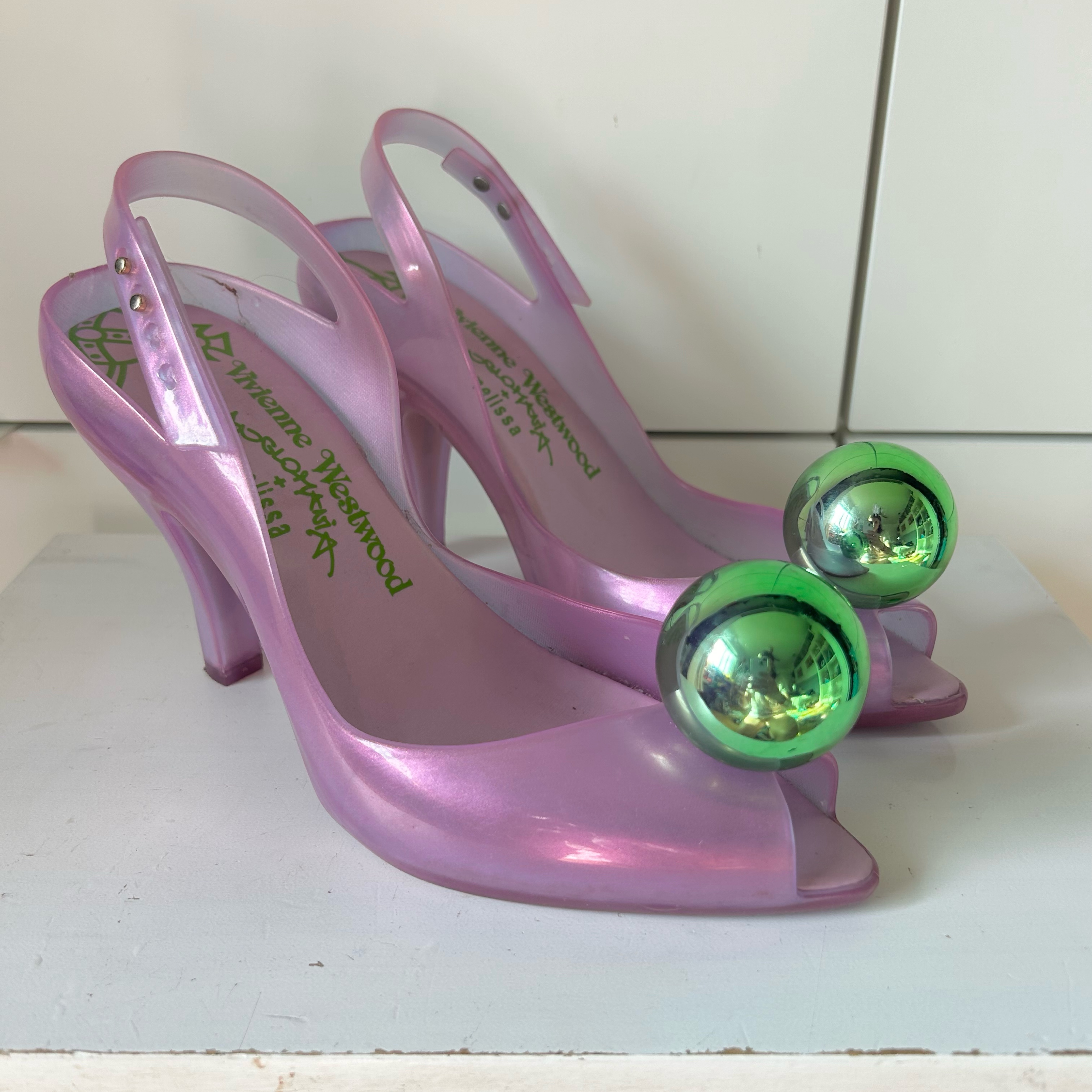 From the iconic 2008 collaboration of Vivienne Westwood Anglomania x Melissa, the impossible to find Lady Dragon in pink and green. In nearly perfect conditions, they are a piece of fashion history for sure. Did i mention that they are extra comfortable?
