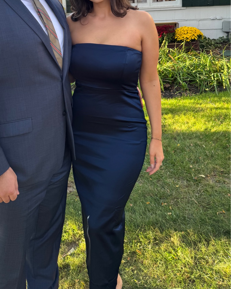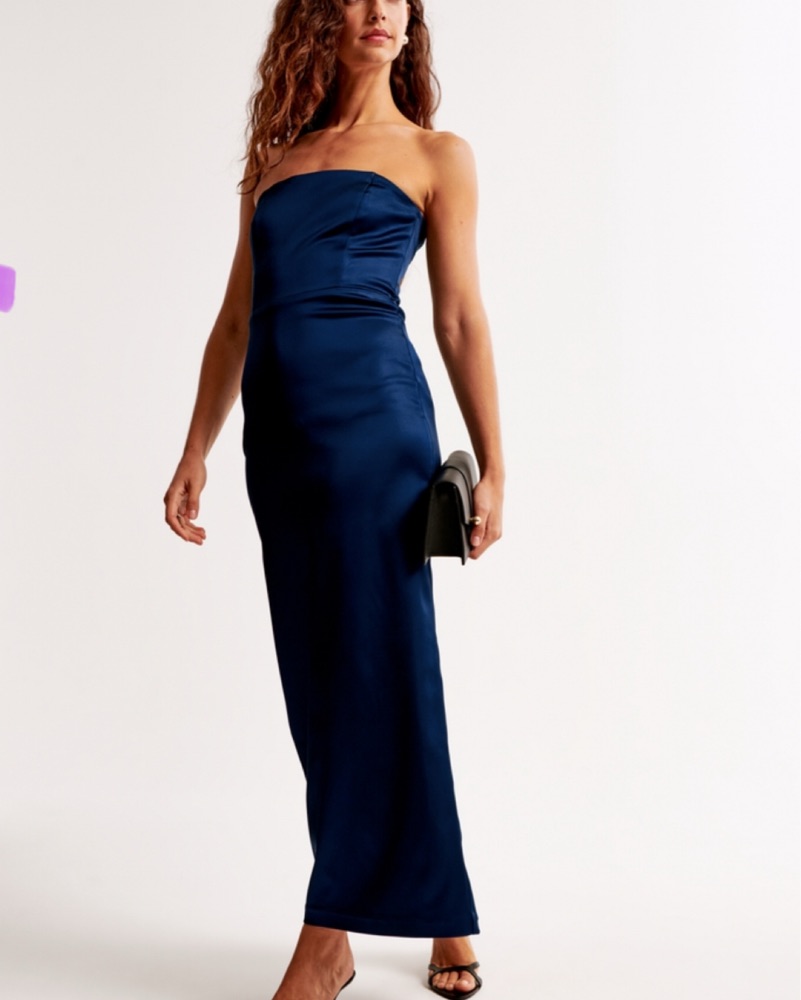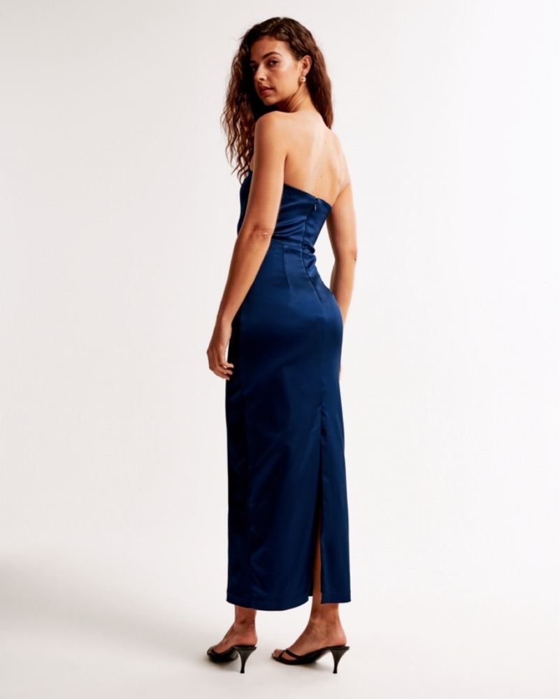 Flattering strapless maxi dress in our stretch-enhanced satin sculpt fabric, featuring a clean column skirt, adjustable and removable straps, center back-slit detail and functional zipper closure for the perfect fit.