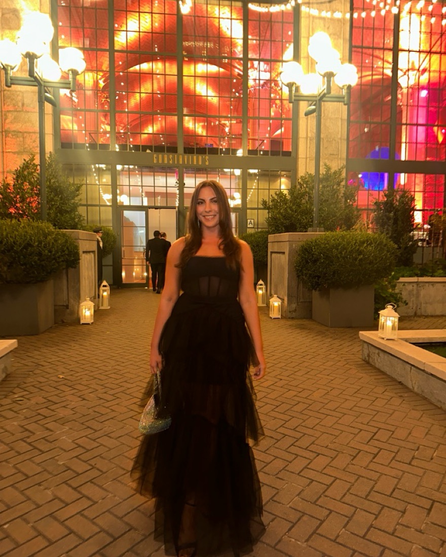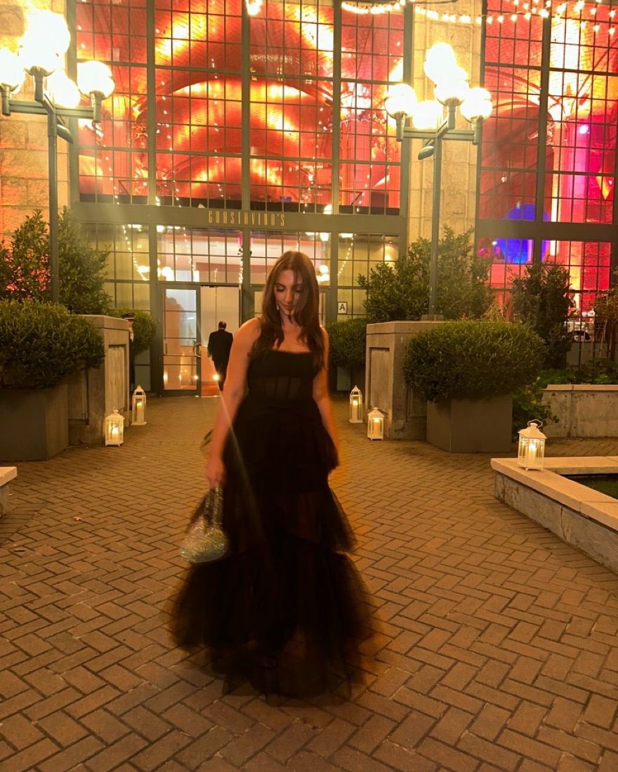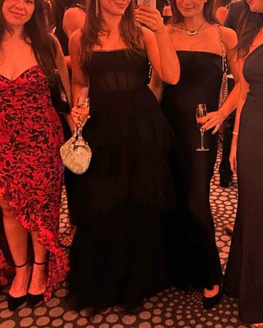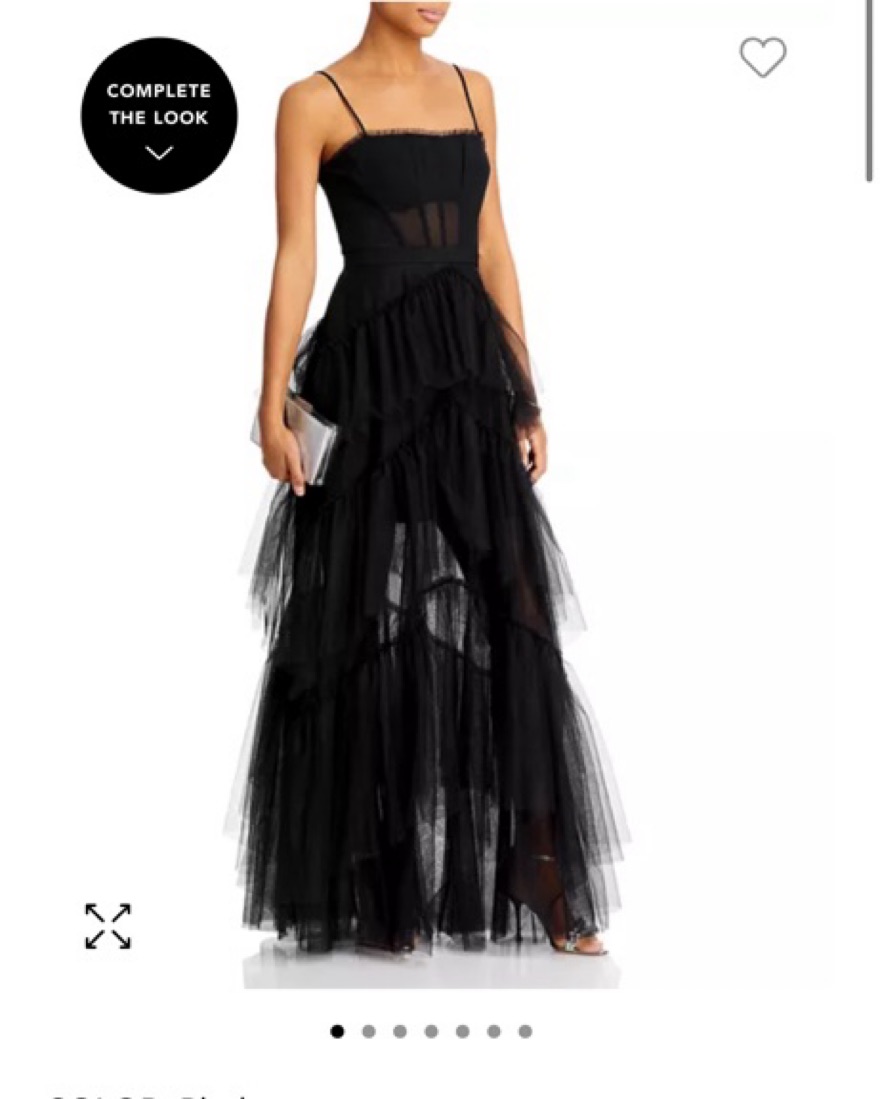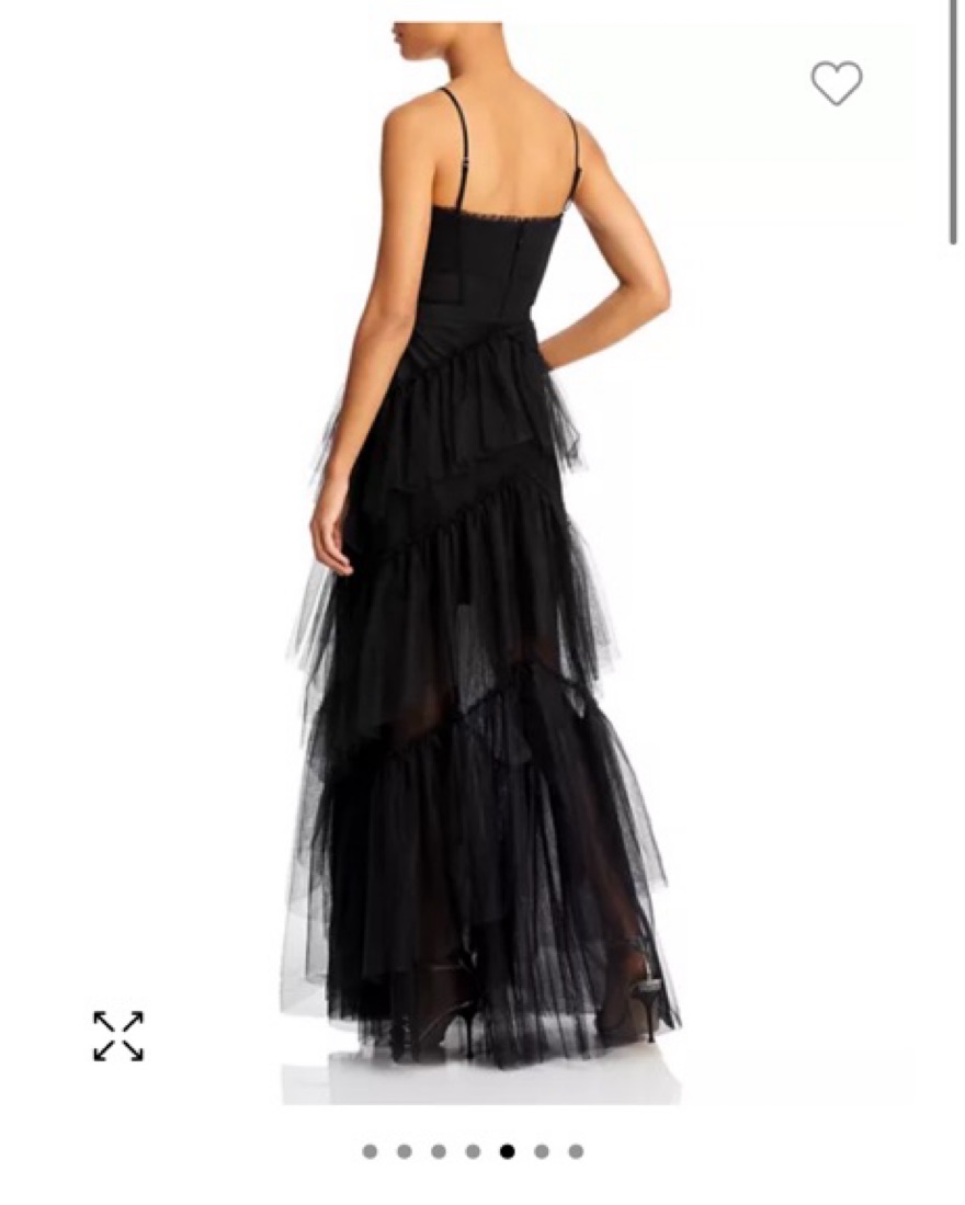 Tulle gown for black tie occasions. Ruffle-trimmed straight neck and back.Adjustable shoulder straps, sleeveless.Inner grip trims, boning in bodice.Semi-sheer corset-style bodice