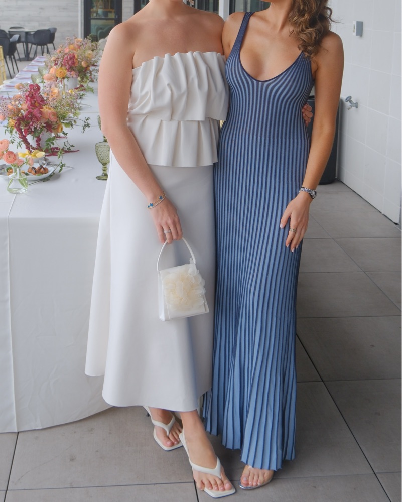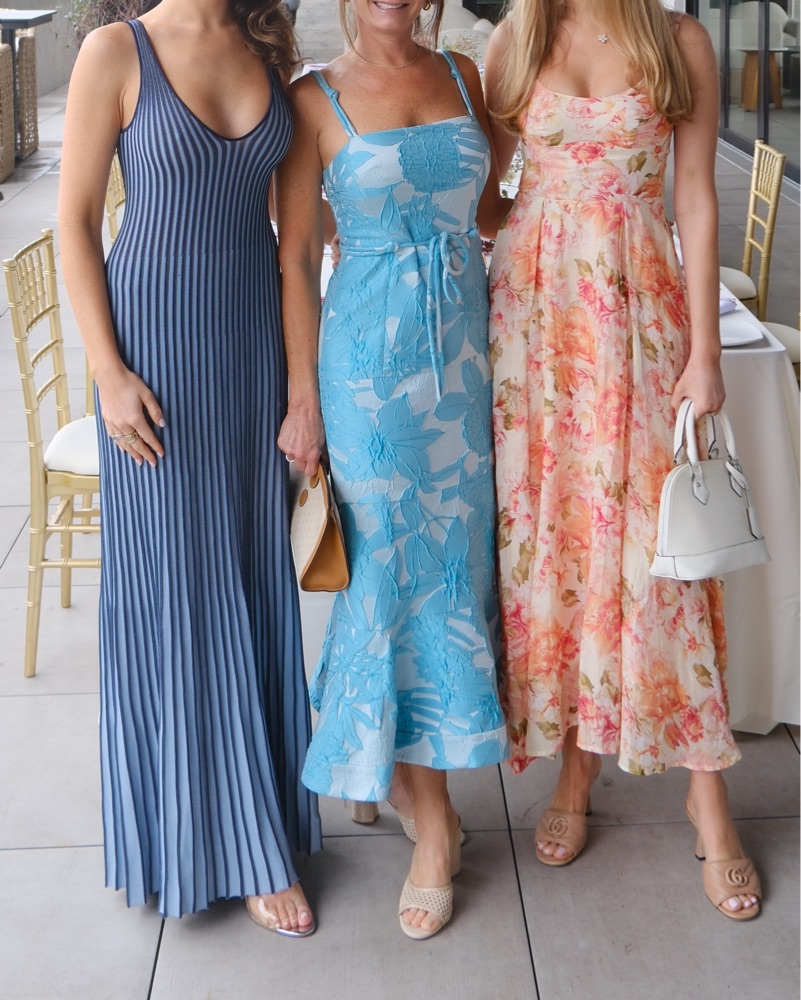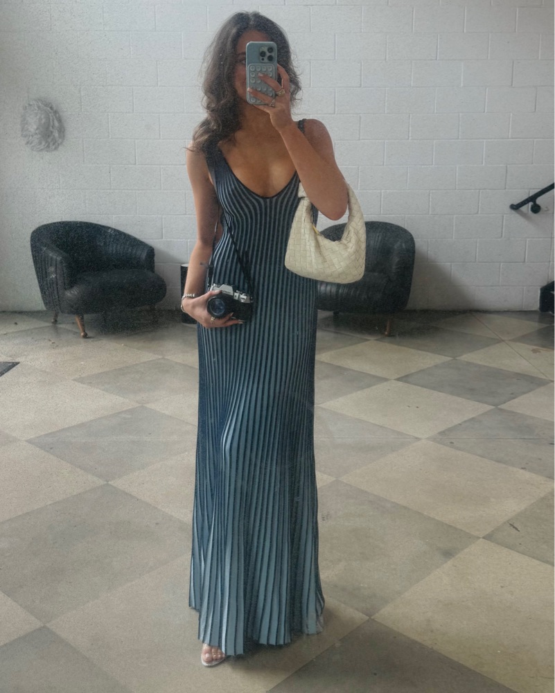 A sleeveless, maxi length dress made out of a flattering two-toned pleated rib knit fabric. This slip-on dress features a deep v neckline and slightly fluted skirt. 🩵 perfect for bridal showers, rehearsal dinners, date nights, etc.
