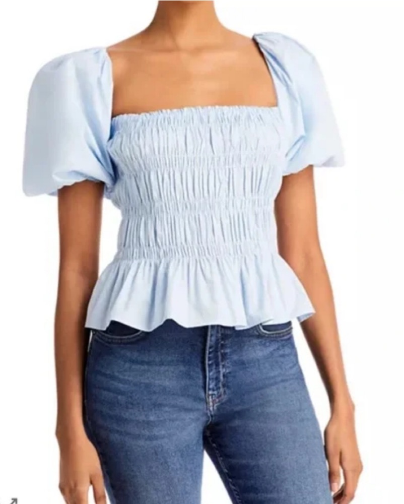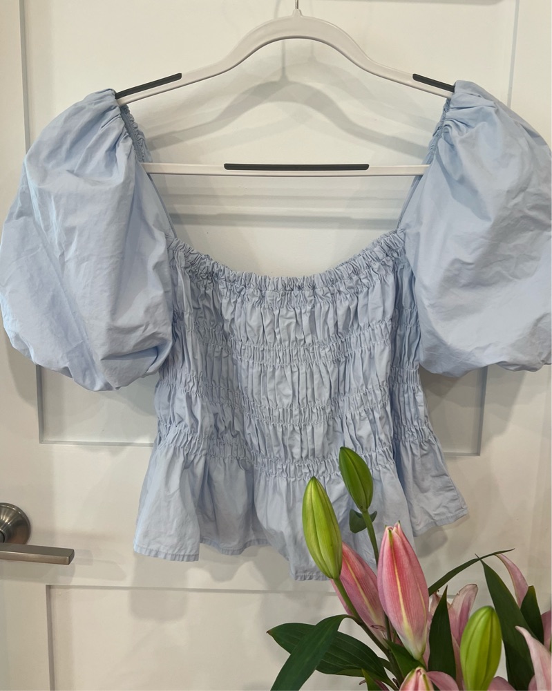 This delicate puff-sleeved blouse is perfect for a special occasion. The ruffled details add a feminine, romantic touch that would be ideal for a date night or garden party. Small ink stain on the front-right hem of the top.