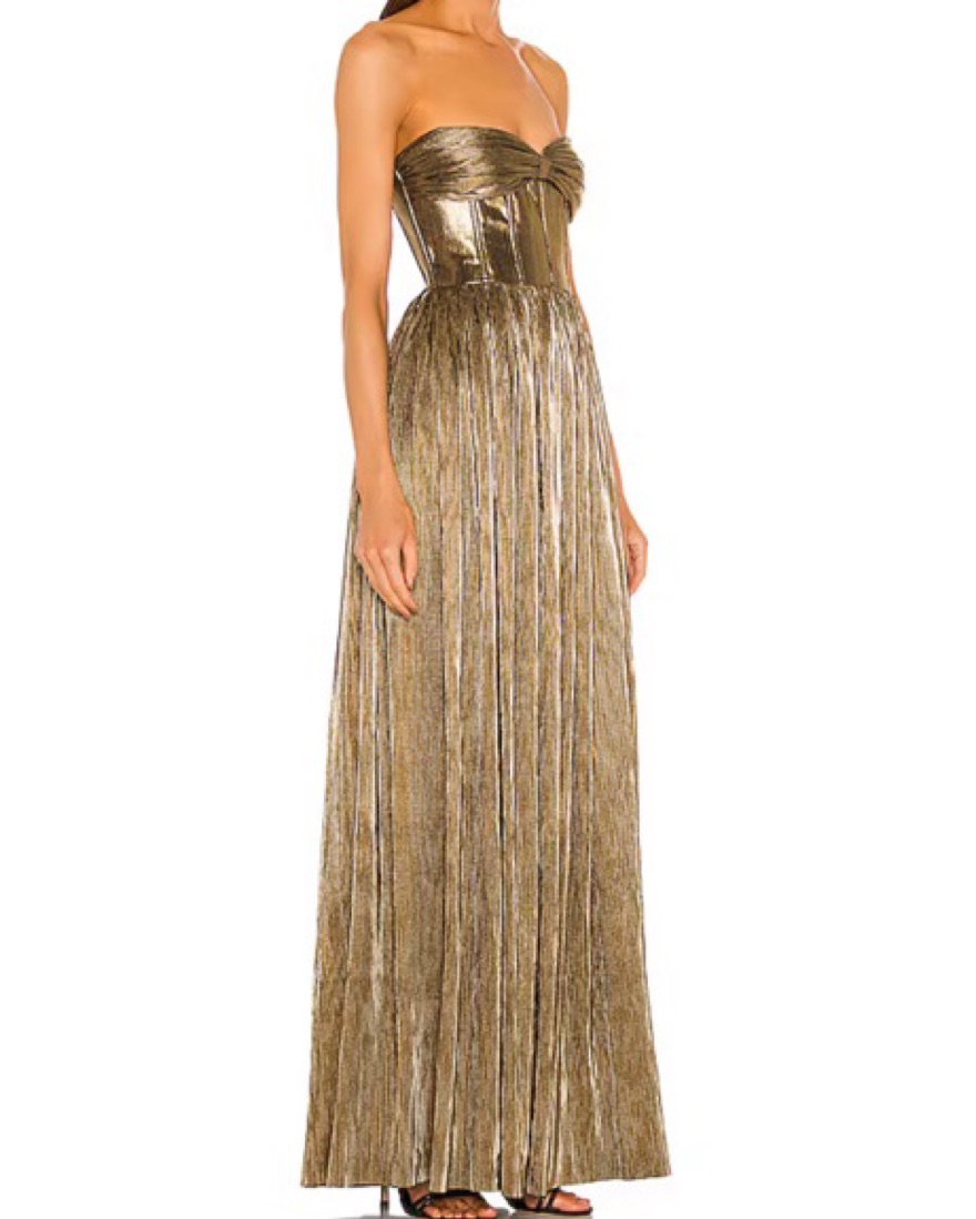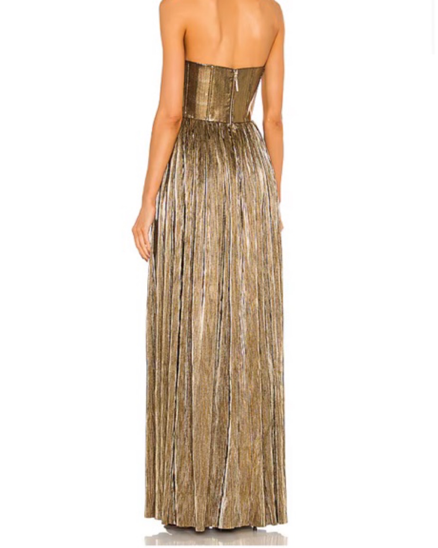 Stunning gold pleated maxi dress perfect for a formal event or evening out. The metallic finish adds an elegant touch.