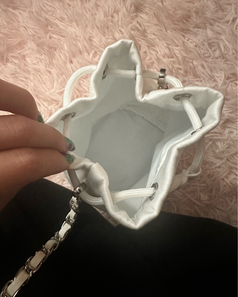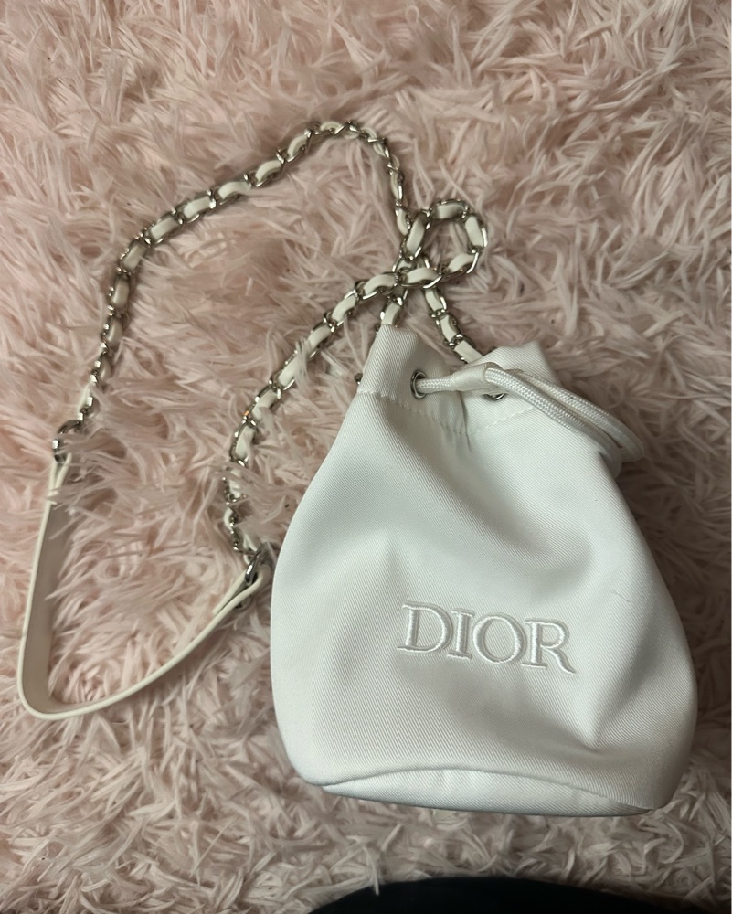 small white Dior bucket bag. to be clear, a skincare set came in here and i stuck a chain on it. about 99% of the time, i think that is so tacky, but hear me out: this doesn’t say “beauty” or “perfume” anywhere on the exterior. it’s kind of perfect!