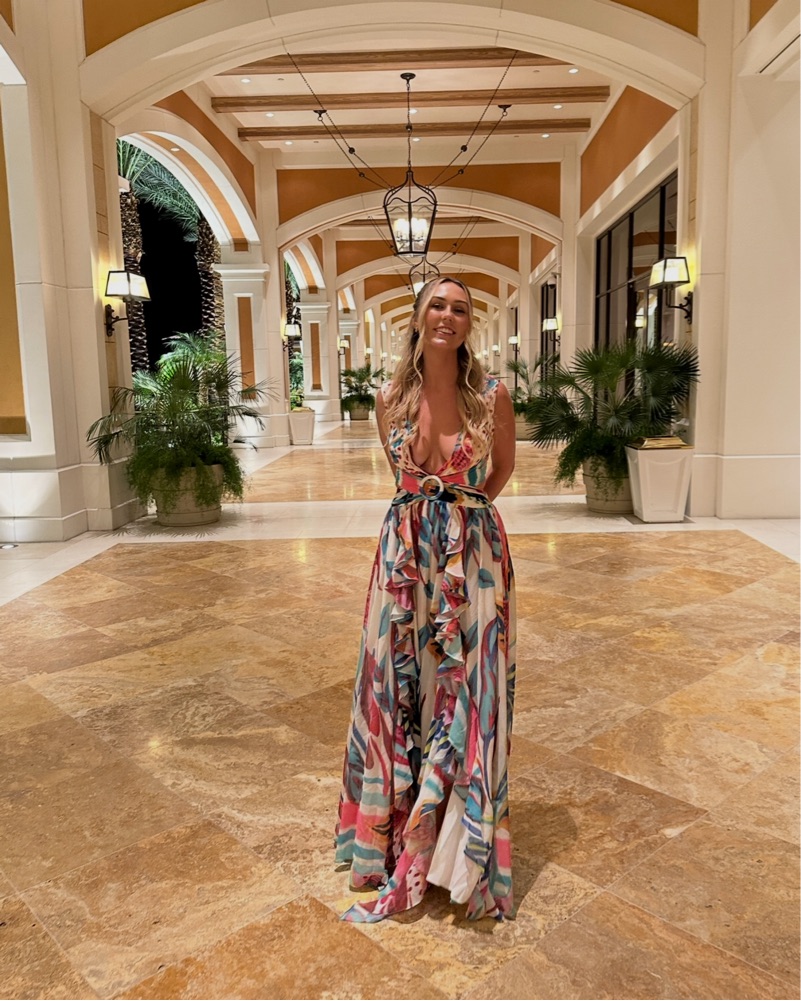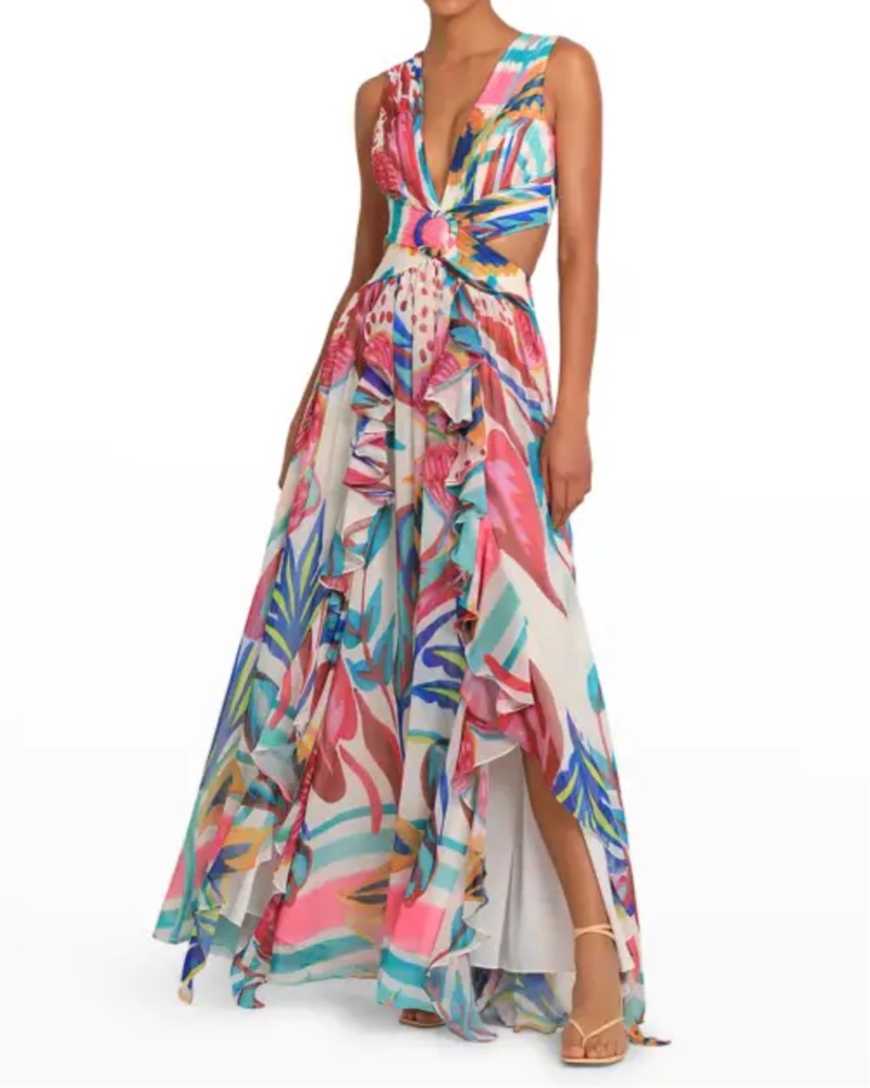 This stunning maxi dress features a vibrant tropical floral print that is perfect for a summer vacation or beach wedding.