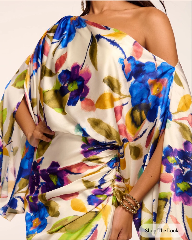 This stunning one-shoulder maxi dress is perfect for a summer wedding or special event. The vibrant floral print and flowing silhouette create a chic and elegant look.