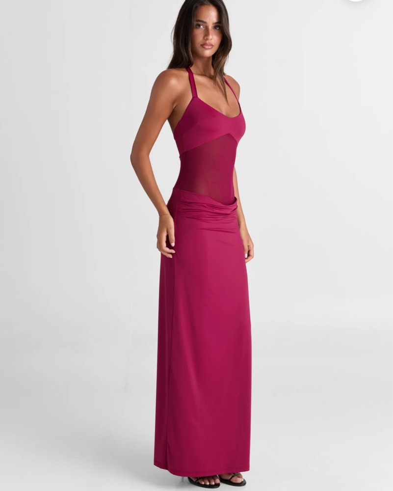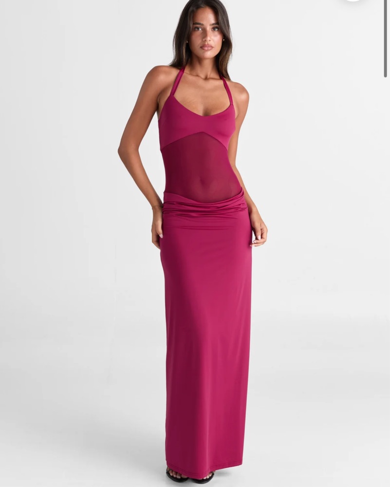 Sleek and effortlessly chic, the Sariya Maxi Dress is designed to make a bold statement. Featuring a figure-hugging silhouette, this dress boasts a sheer mesh waist panel that cinches and defines the body, creating an ultra-flattering look. The halter neckline adds a touch of elegance, while the ope