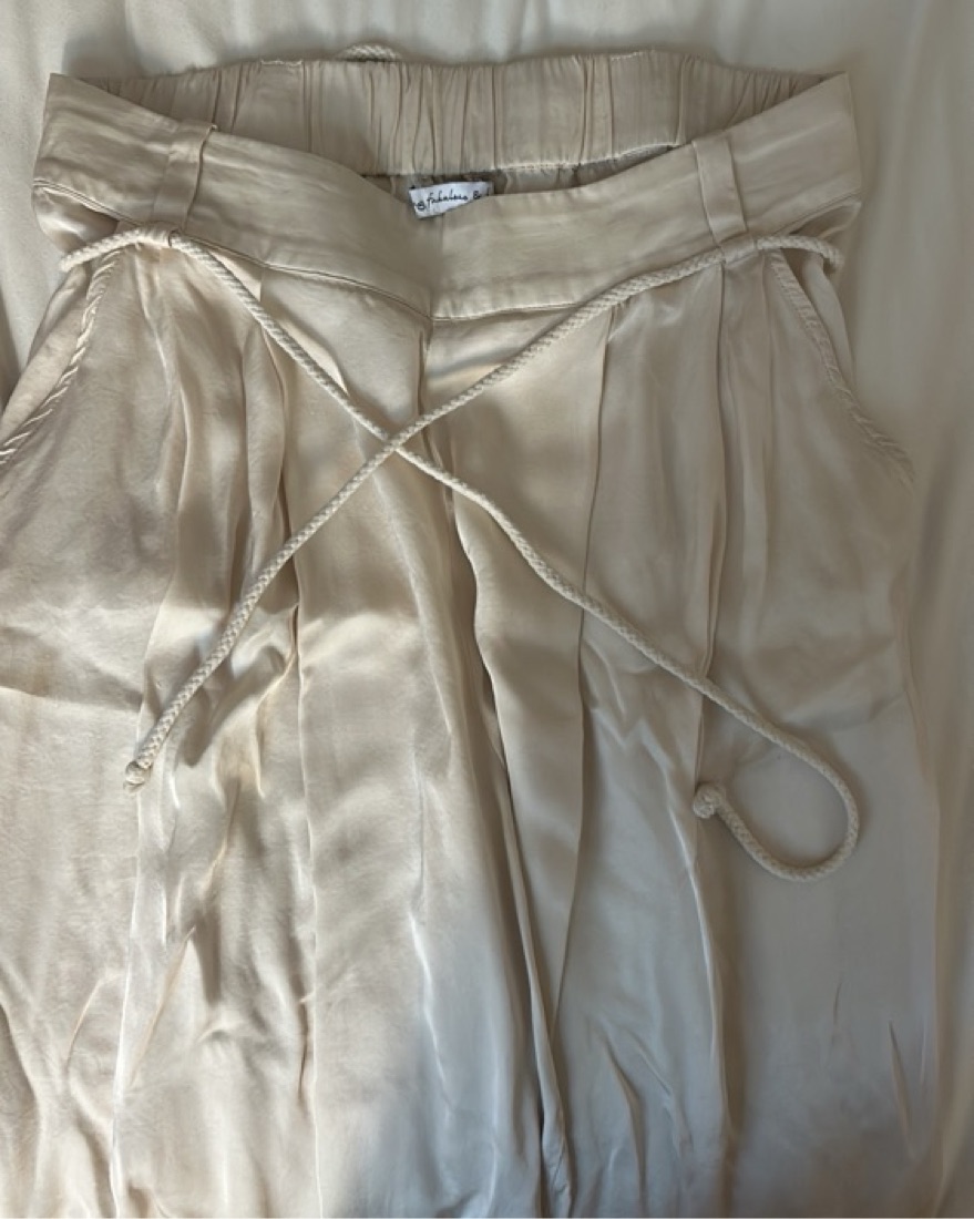 Young, Fabulous, and Broke silk/satin flowy pants with tie in the front. Ive worn these out in the summer and to work. Tagged CG for visibility
