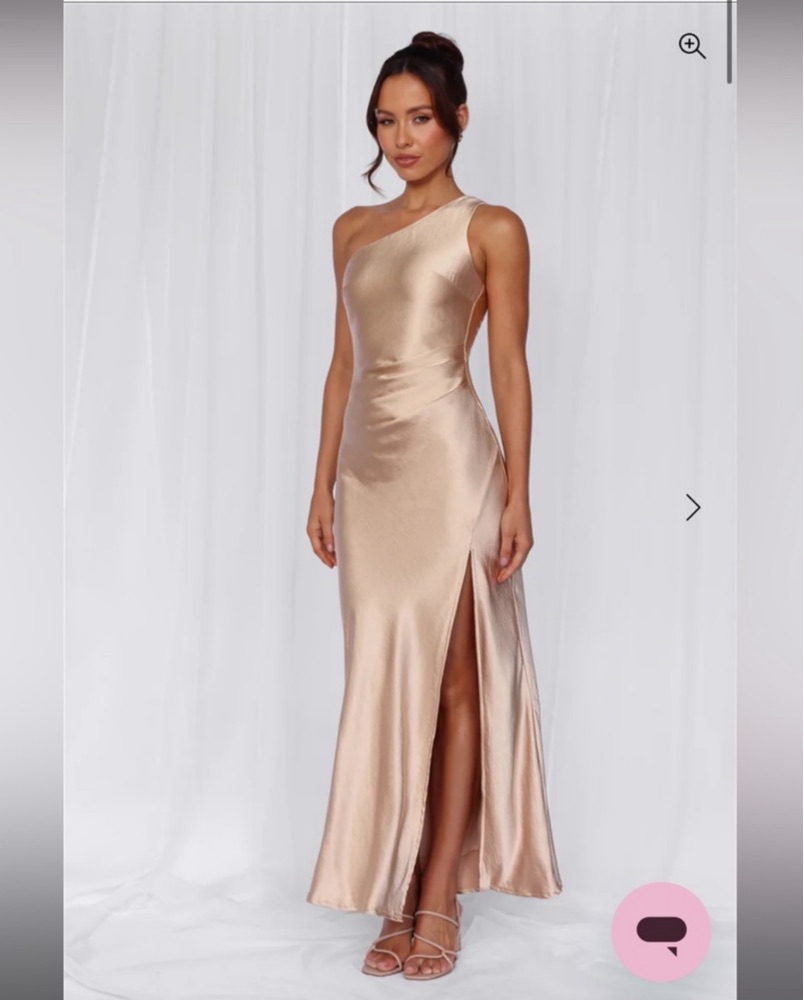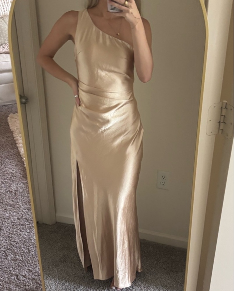 Asymmetrical one shoulder champagne dress. Never worn. New with tags.