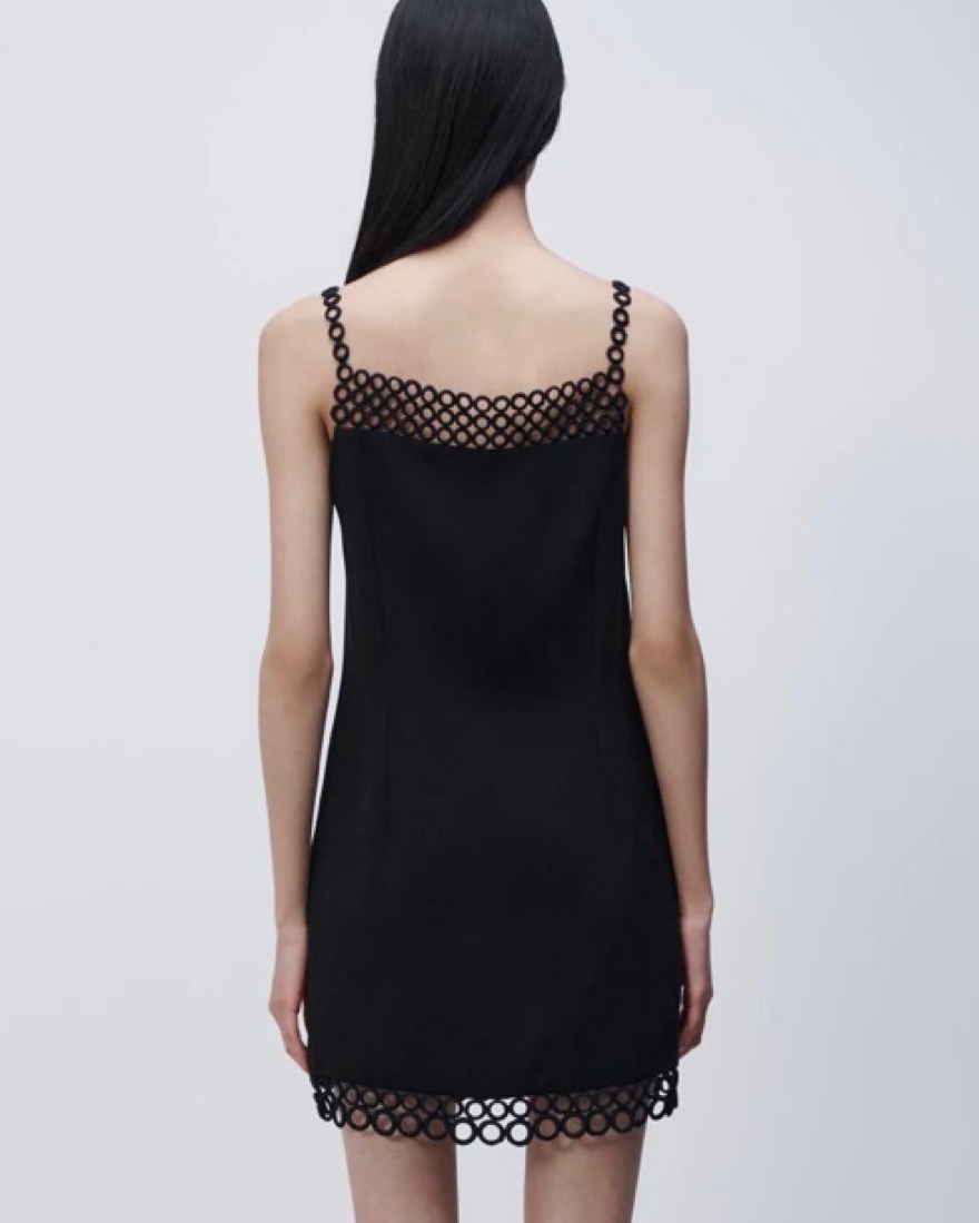 Never worn! dress is trimmed with eyelets along the square neckline and hem, baring touches of skin. It's made from smooth black crepe that loosely skims the body and has adjustable straps