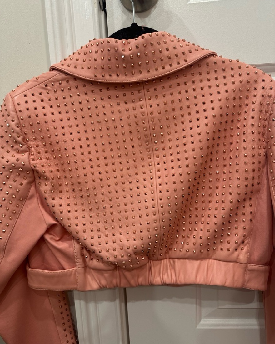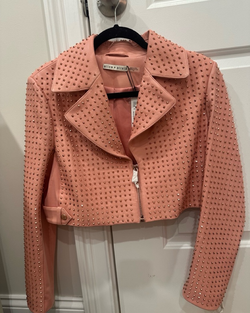 New with tags Alice and Olivia Yardley jacket. Pretty pink color! Perfect condition. Size large. Runs small. Fits a size 10-12 comfortably.
