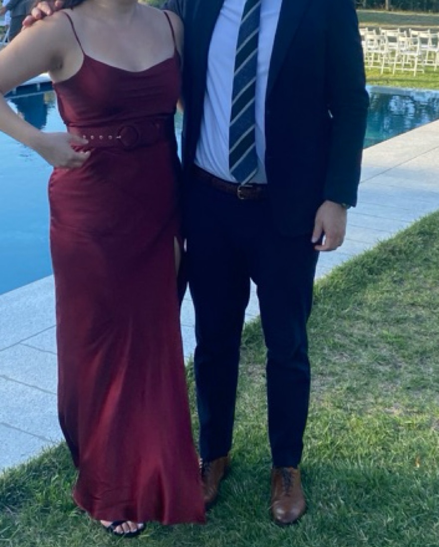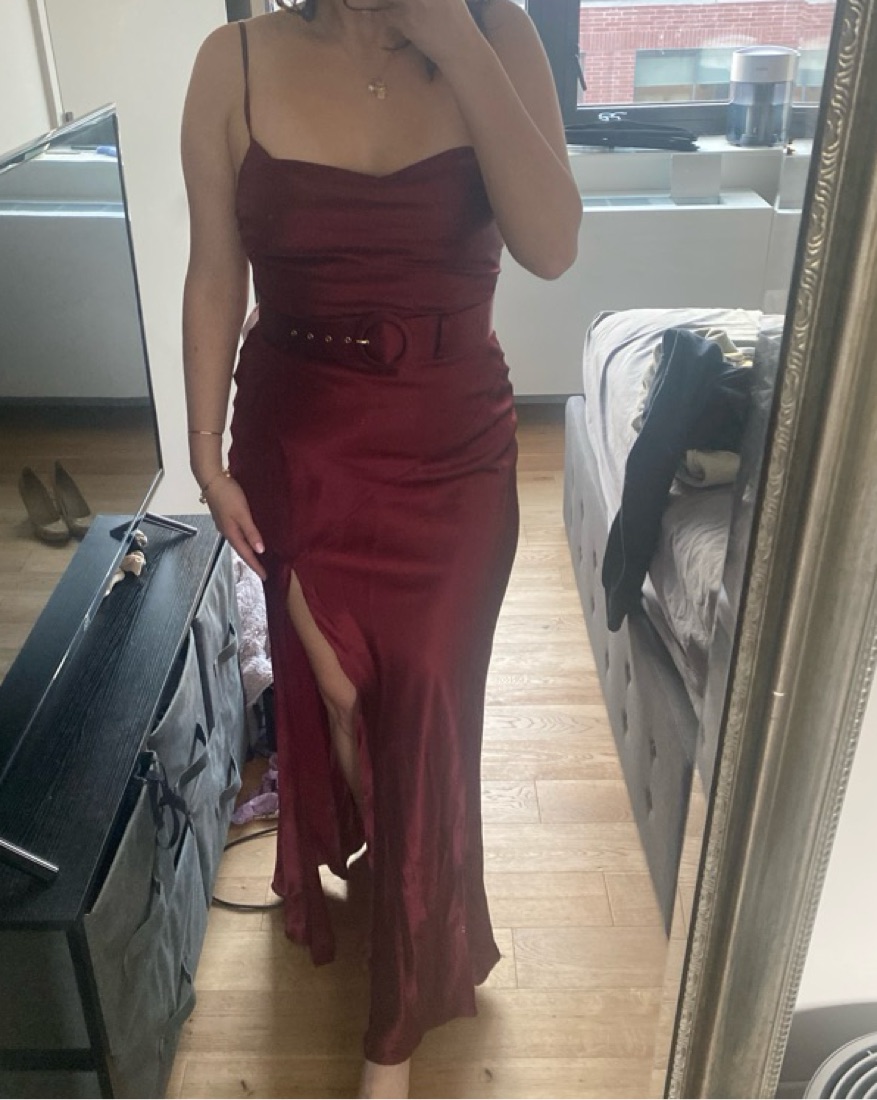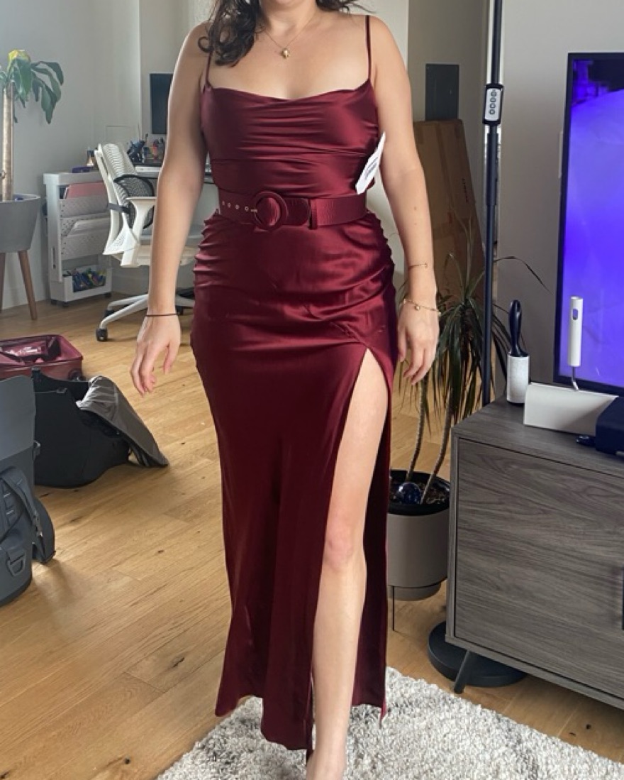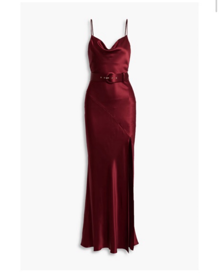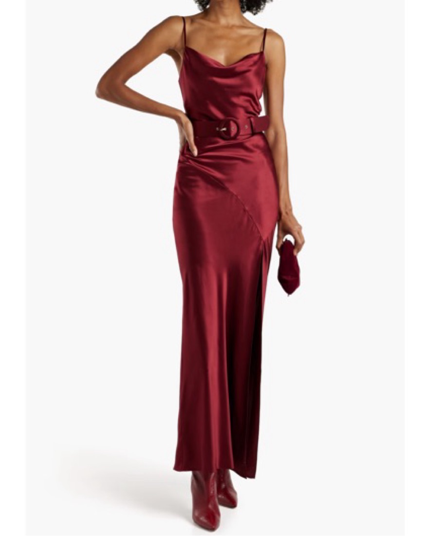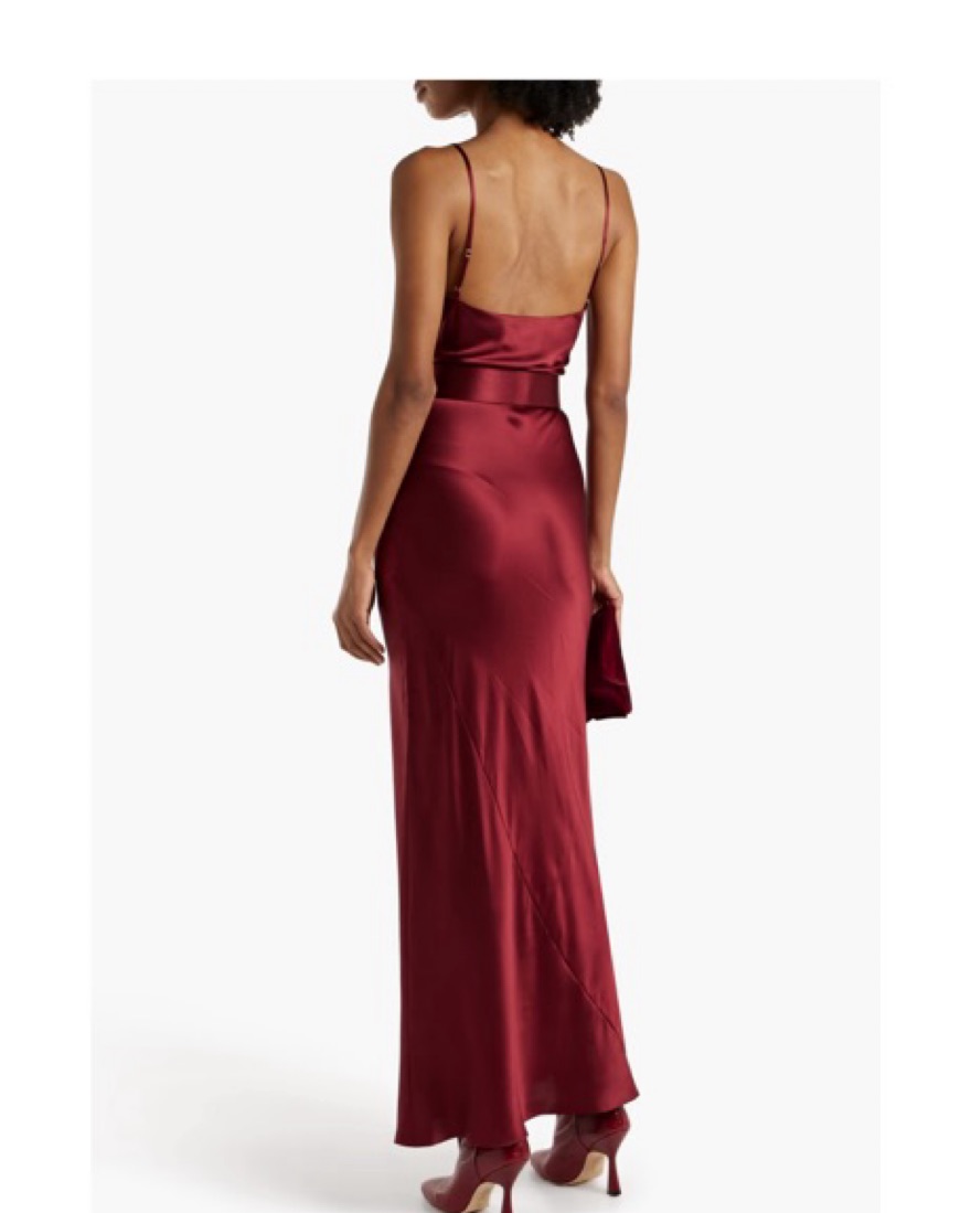 NICHOLAS Simone belted silk-satin maxi dress. Color: Claret 100% Silk Draped Adjustable straps Detachable belt Front split Slips on Non-stretchy fabric Mid-weight fabric