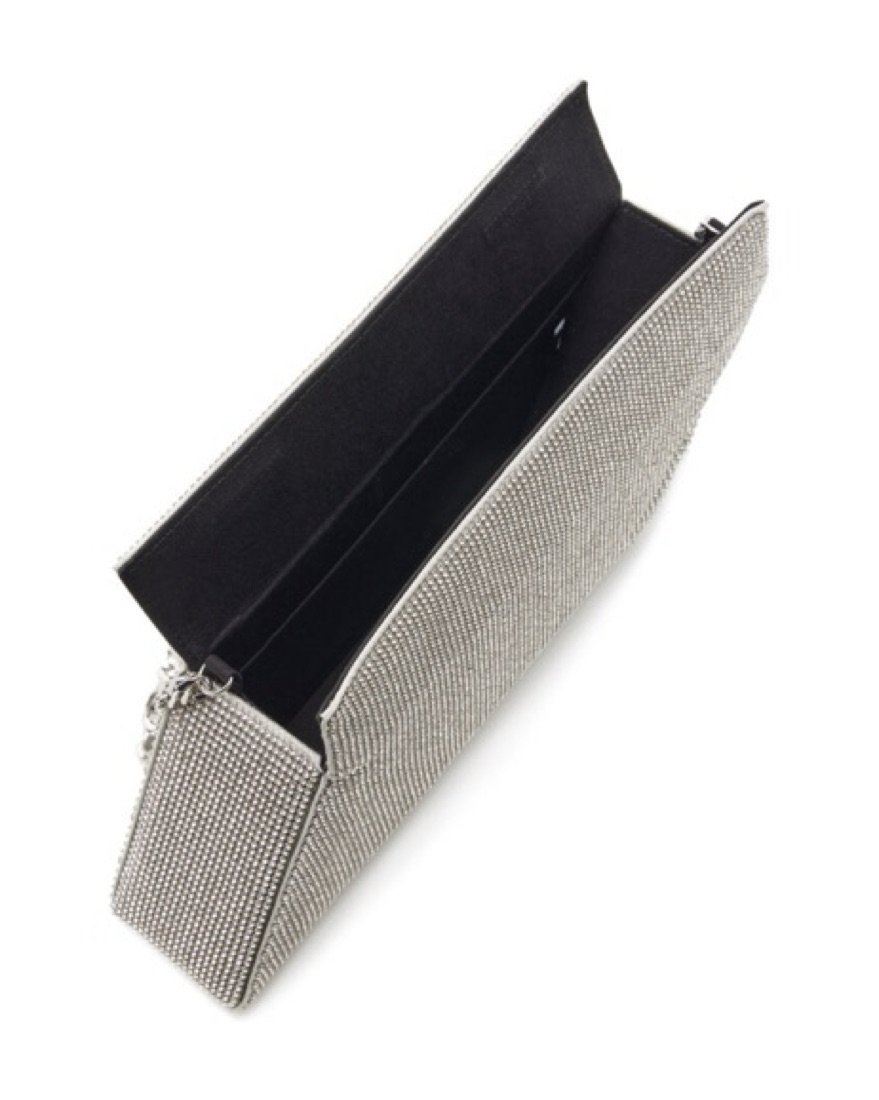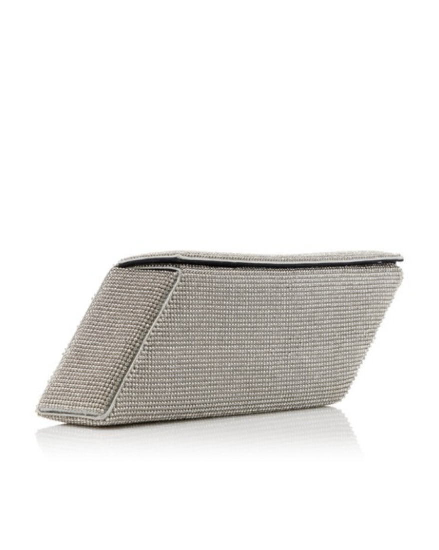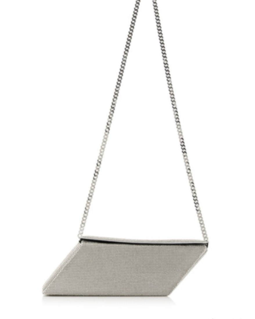 Covered in glistening crystals, the label's clutch has an angular silhouette that's sized to hold just the essentials-think cell, cards, and a key.