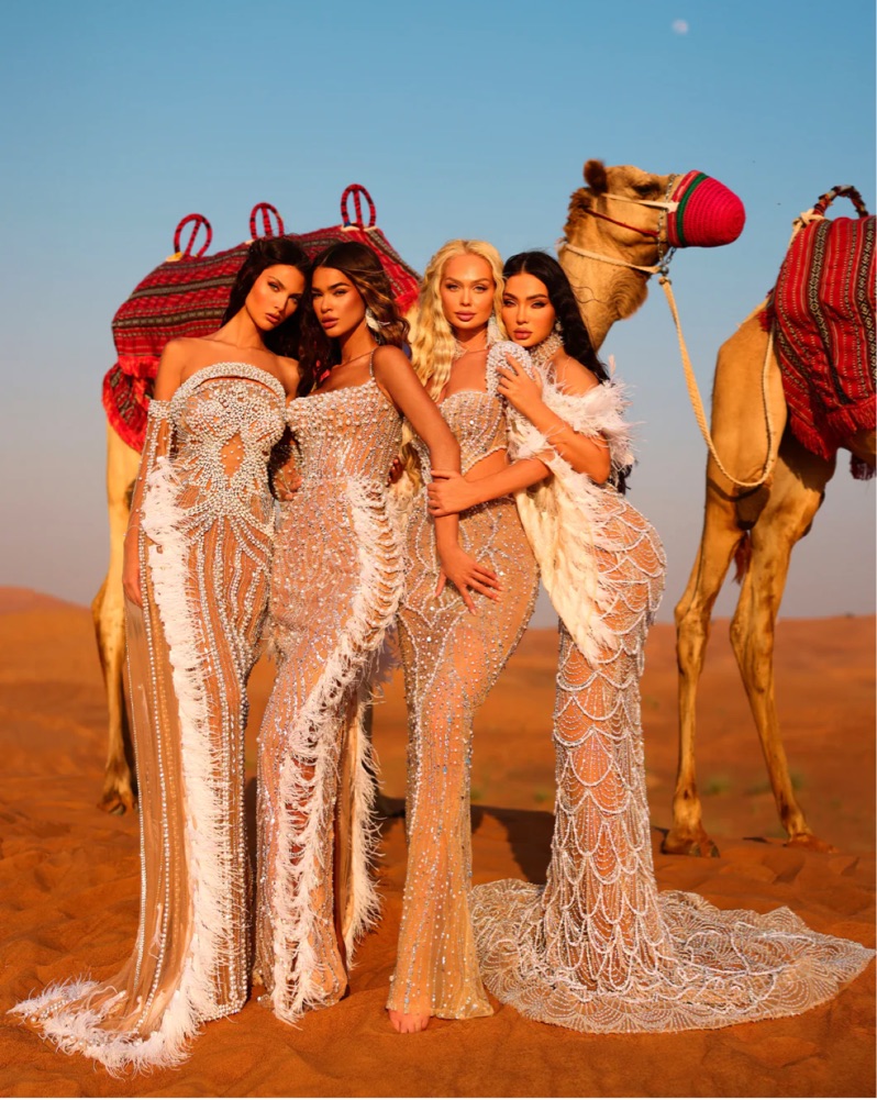 Beautiful beaded pearl and crystal evening gown. Strapless column shape with corset back. Size 4. Ostrich feather sleeves included. Made in Albania by designer. Perfect for a gala or formal event.