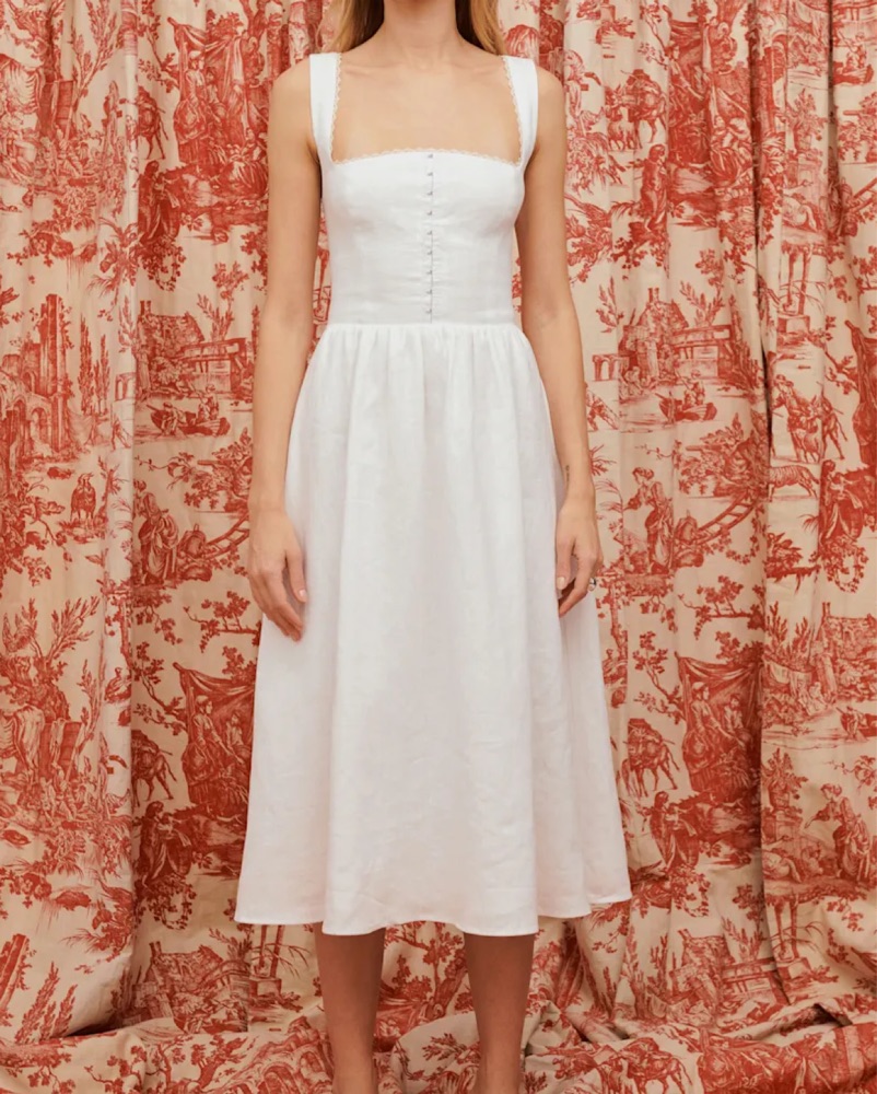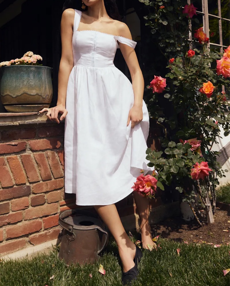 Reformation Tagliatelle White Linen Dress, corset fit, midi length