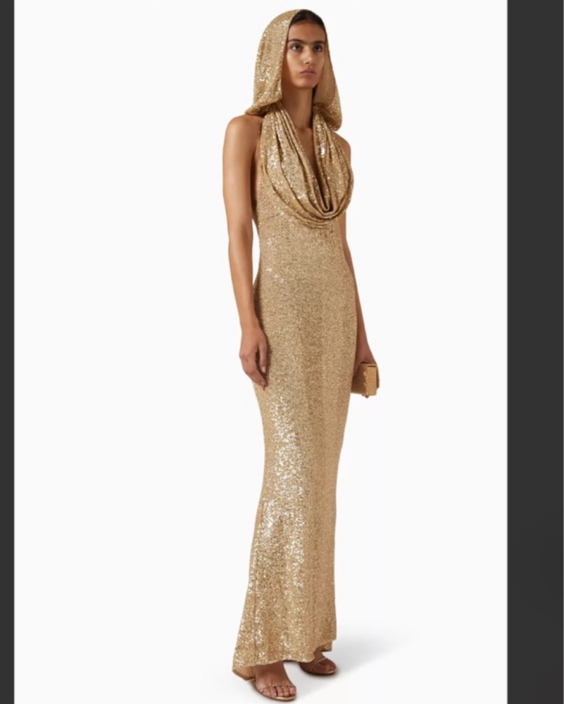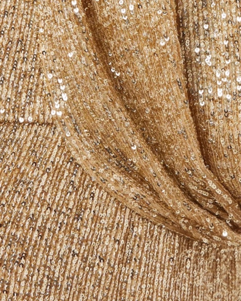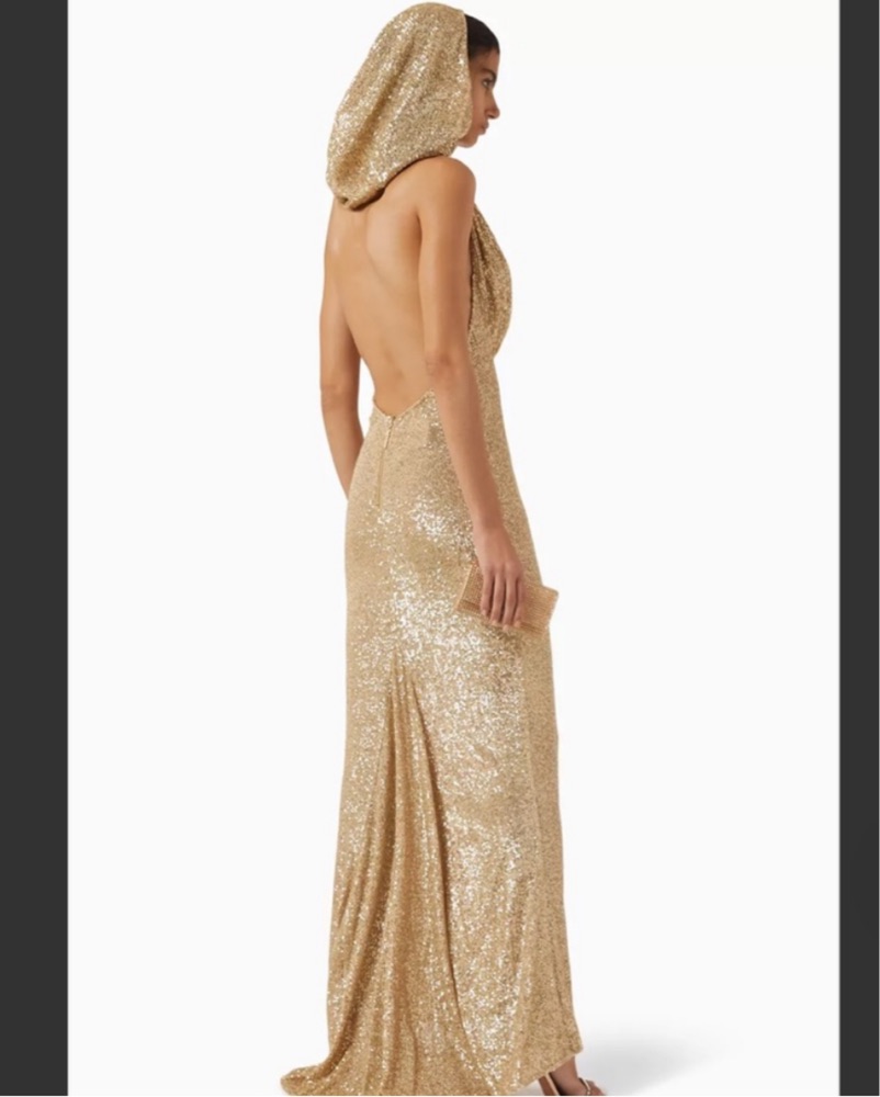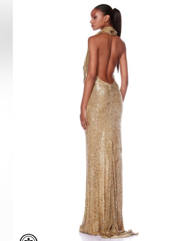 Step into the spotlight with this Bronx and Banco gown, featuring a dazzling gold sequin design perfect for a night out. The sleeveless dress boasts a sophisticated cowl neck and a backless silhouette, ensuring you make a memorable entrance.