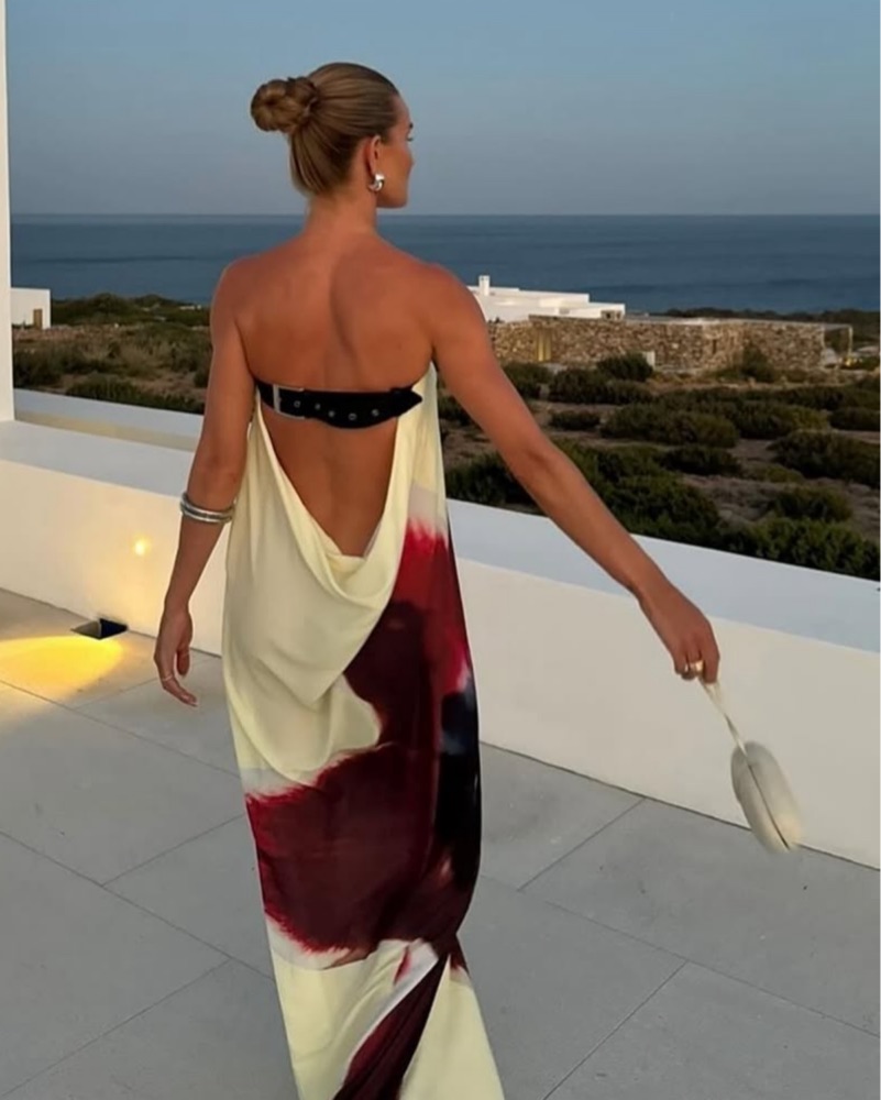 Tailored to fit 5’6 with heels. Size is S/M but could fit XS-M because of adjustable back. Stunning for beach vacation or even casually (see pictured!). Dress is more of a cream/yellow and not white so definitely could work for wedding (also see pictured). No self tanner please! 💕