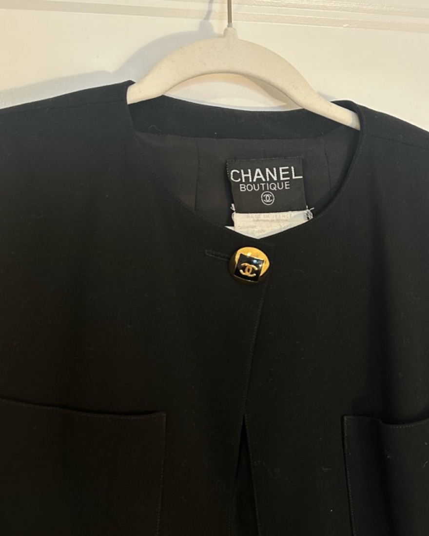 This is vintage chanel boutique. It’s such a beautiful cut with the singular high-neck button closure.