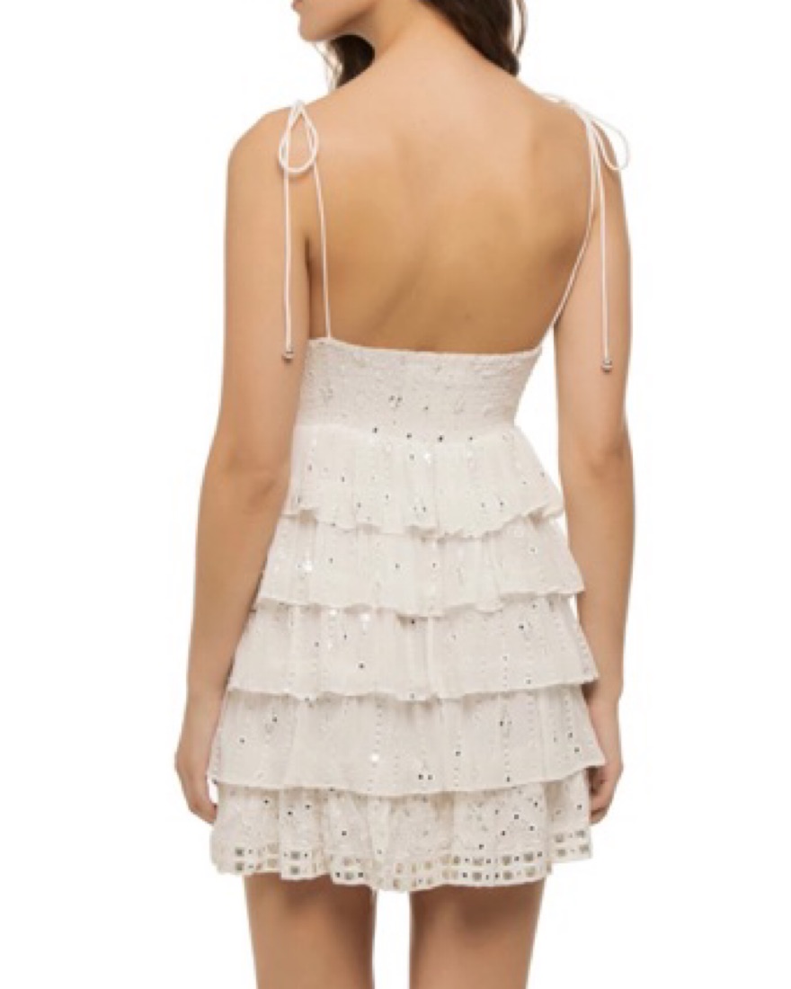 mirror embellishments | tiered skirt | adjustable tie straps | elastic waist