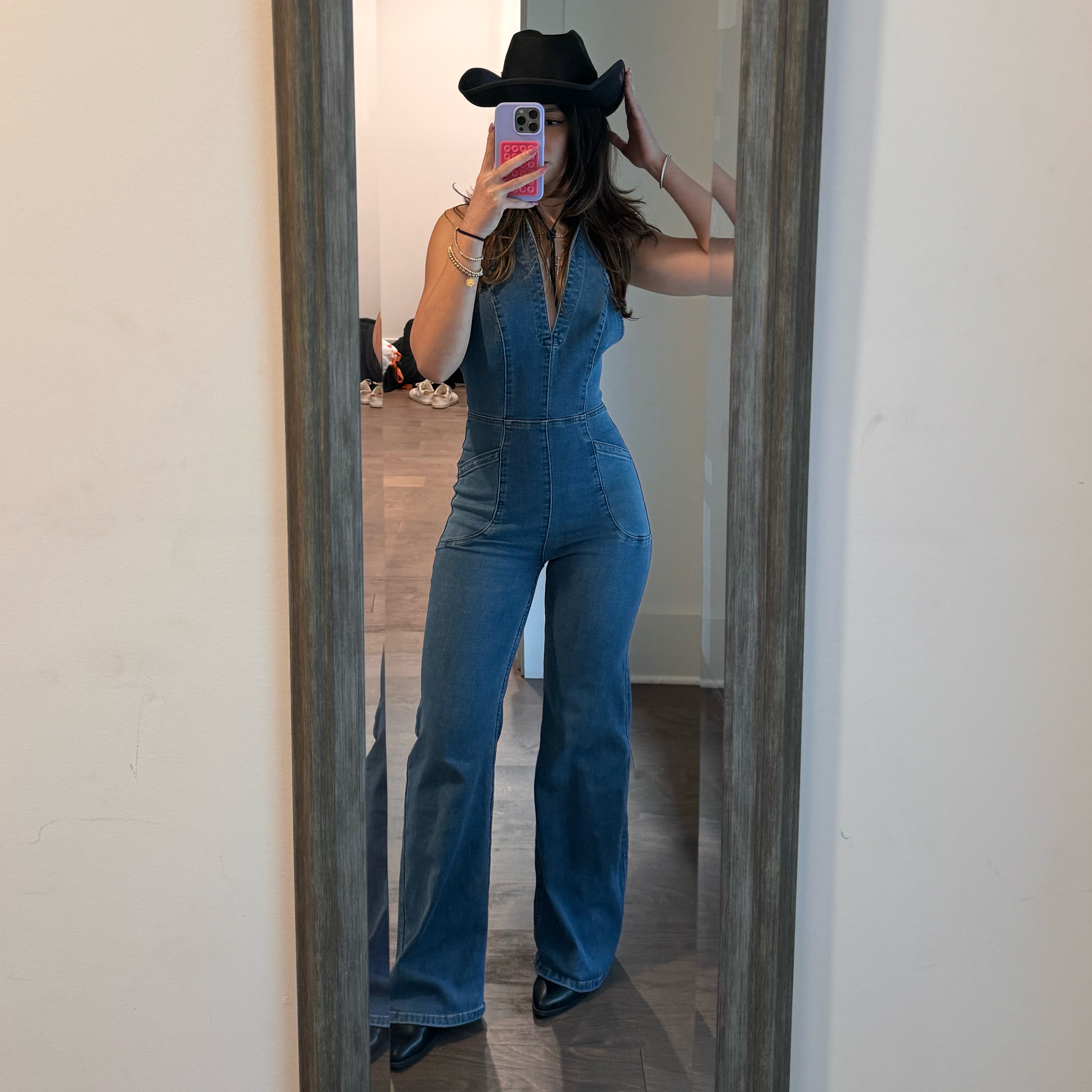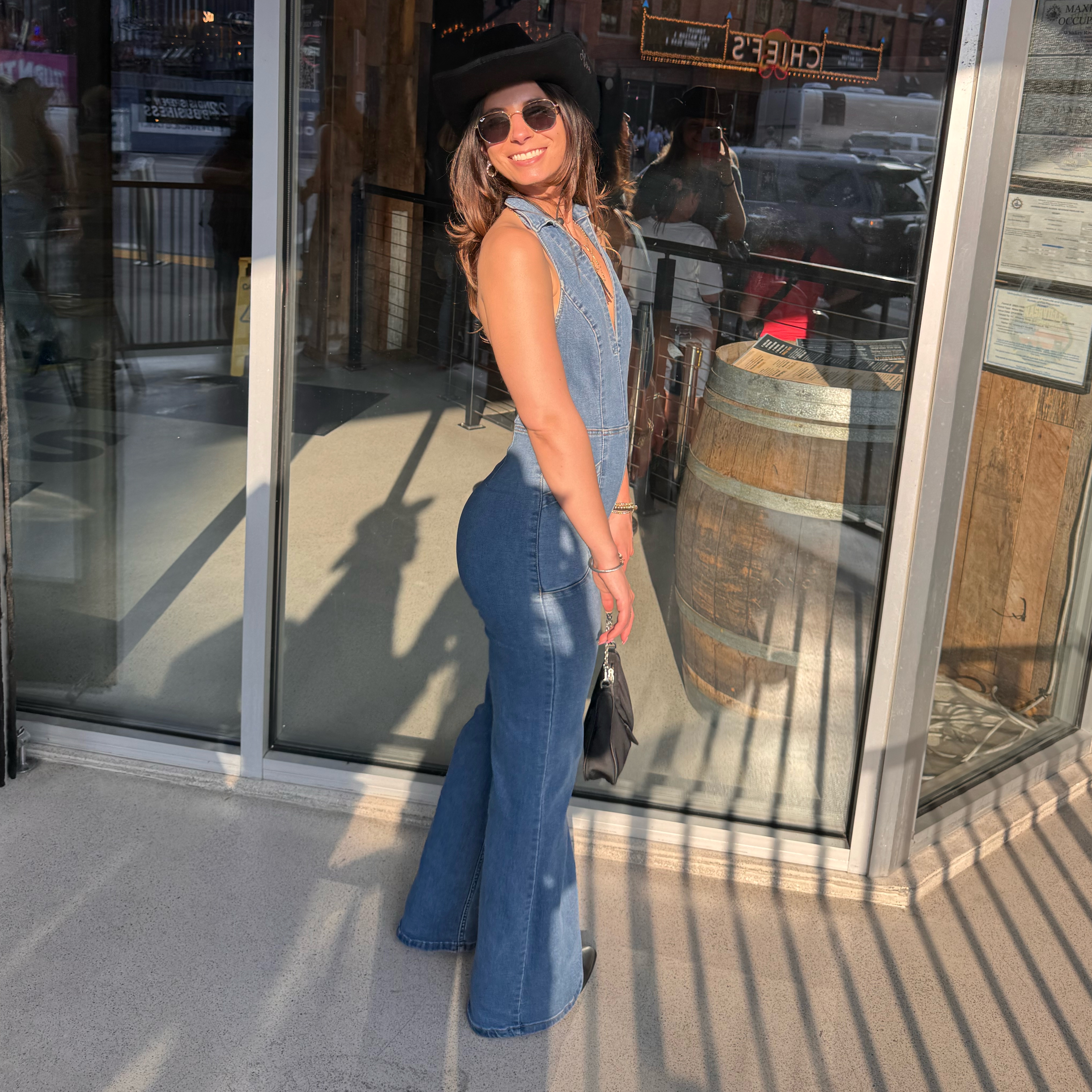 Sweet thing denim jumpsuit. Jean jumpsuit. So stretchy and flattering, wore at a bachelorette and got tons of compliments! Free people. Jean jumpsuit. Bachelorette. Denim outfit. Jeans. Halter denim jumpsuit