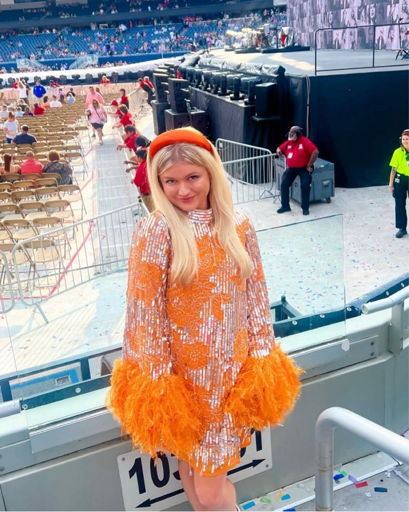ASOS EDITION floral sequin and bead mini dress with faux feather cuff in hot orange! Size 0 but is very loose fitting and can fit sizes 2-4. Worn to the Taylor Swift concert and I had soooo many compliments 🧡 good Halloween costume to go as life of a showgirl!