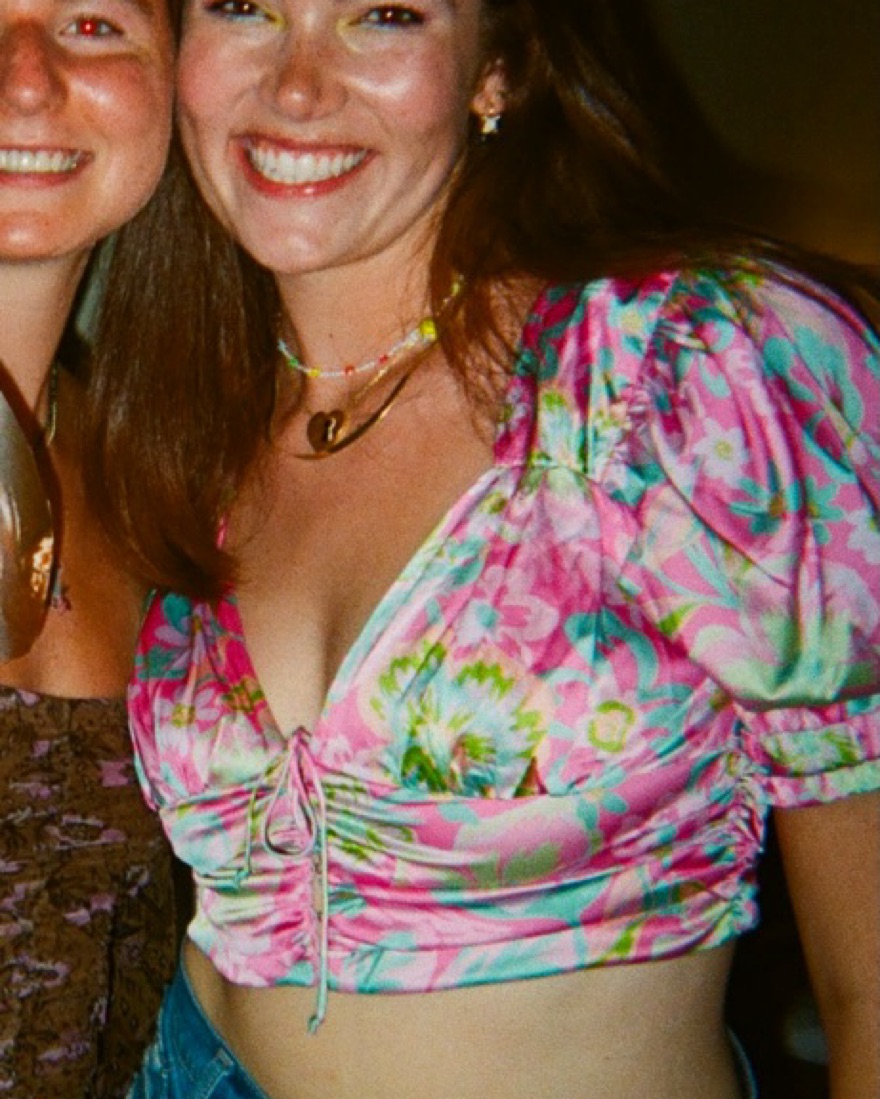 Fun 70s vibe silky crop top. Size large but fits more like a medium. I’m a size 8/Medium and 5’ 10”.