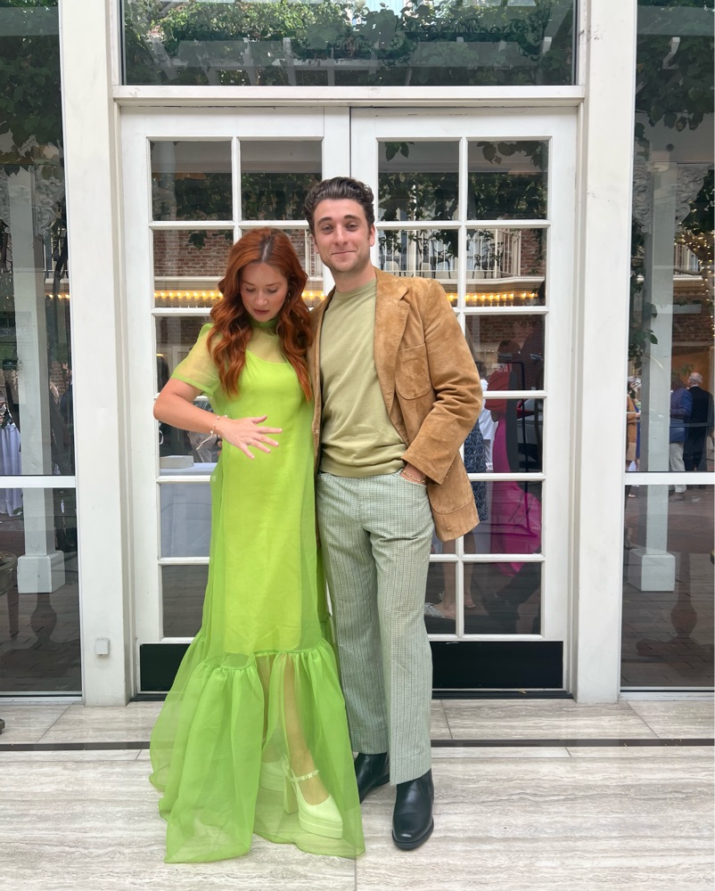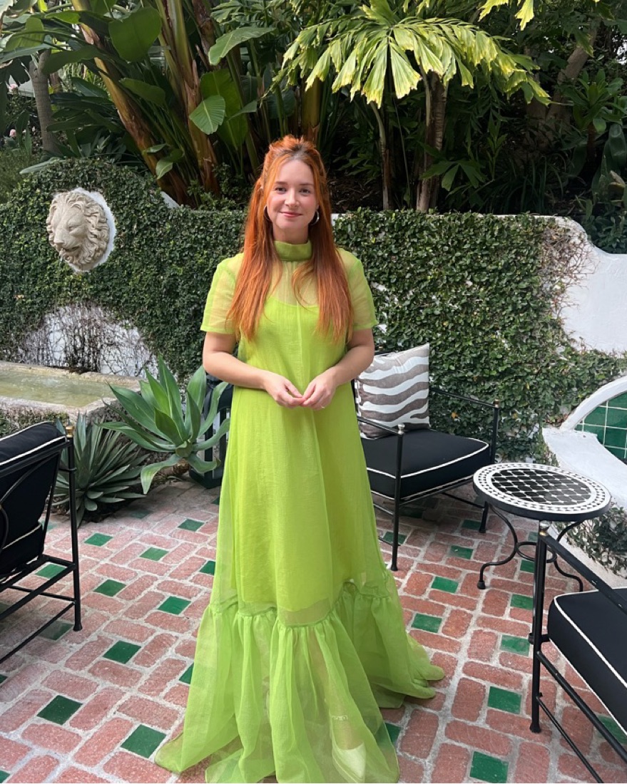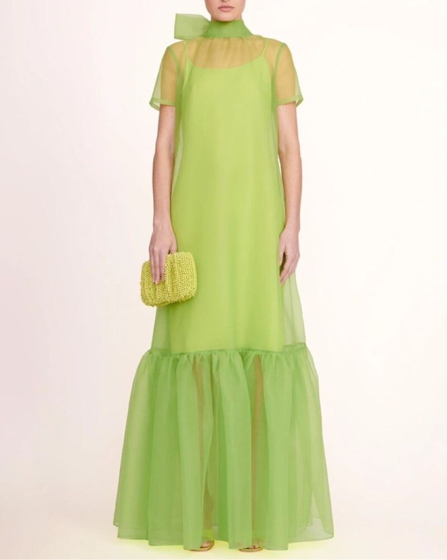STAUD Calluna maxi dress in kiwi green. Such a stunning statement dress for a wedding or special event. The dress is long so plan accordingly. I am 5’6 and wore 4 inch heels.