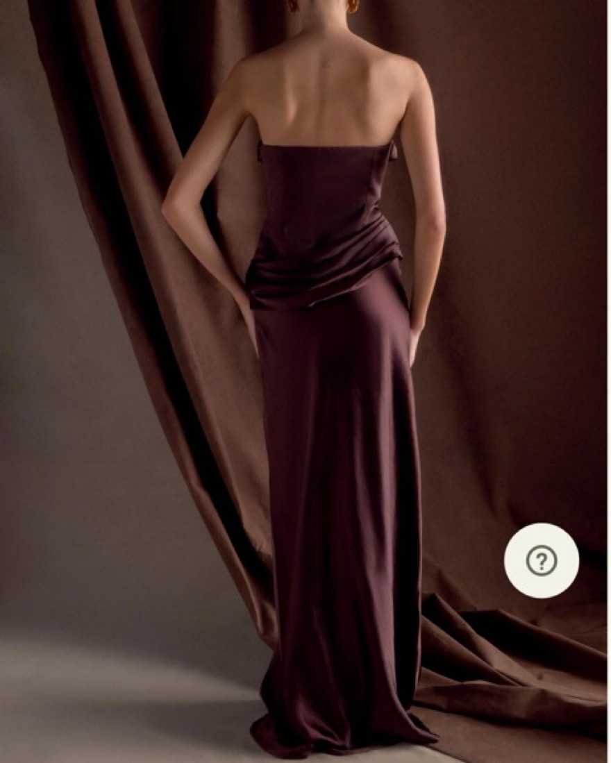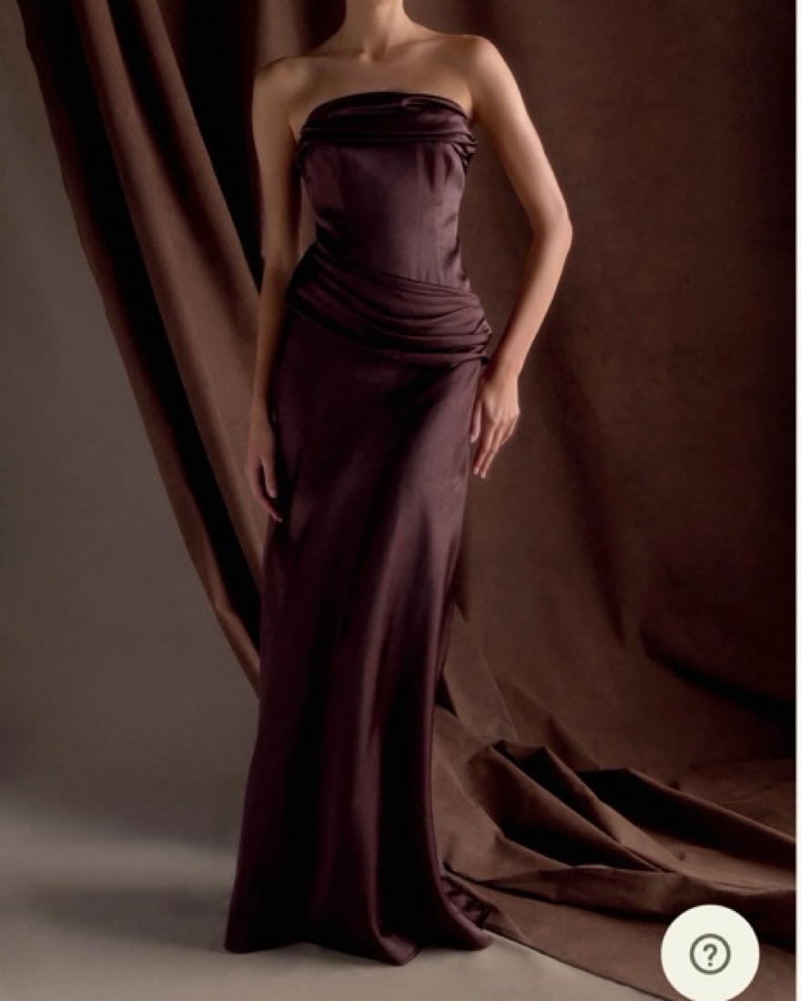 This stunning satin gown in a rich aubergine hue is perfect for a formal event or red carpet occasion. The ruched bodice and flowing skirt create a flattering silhouette.