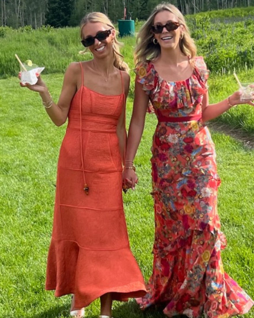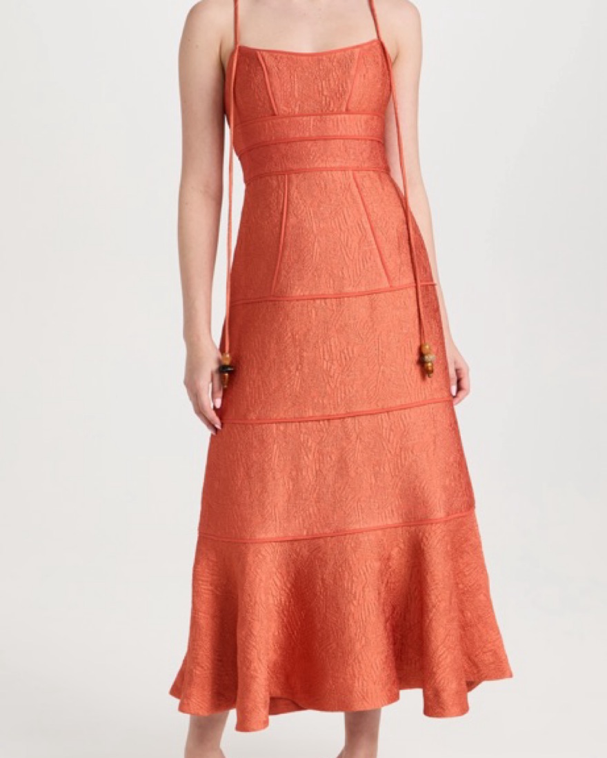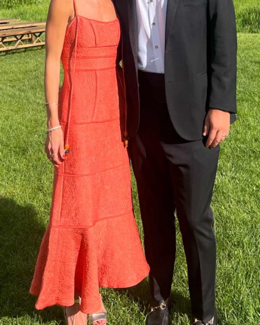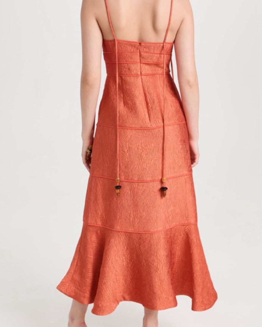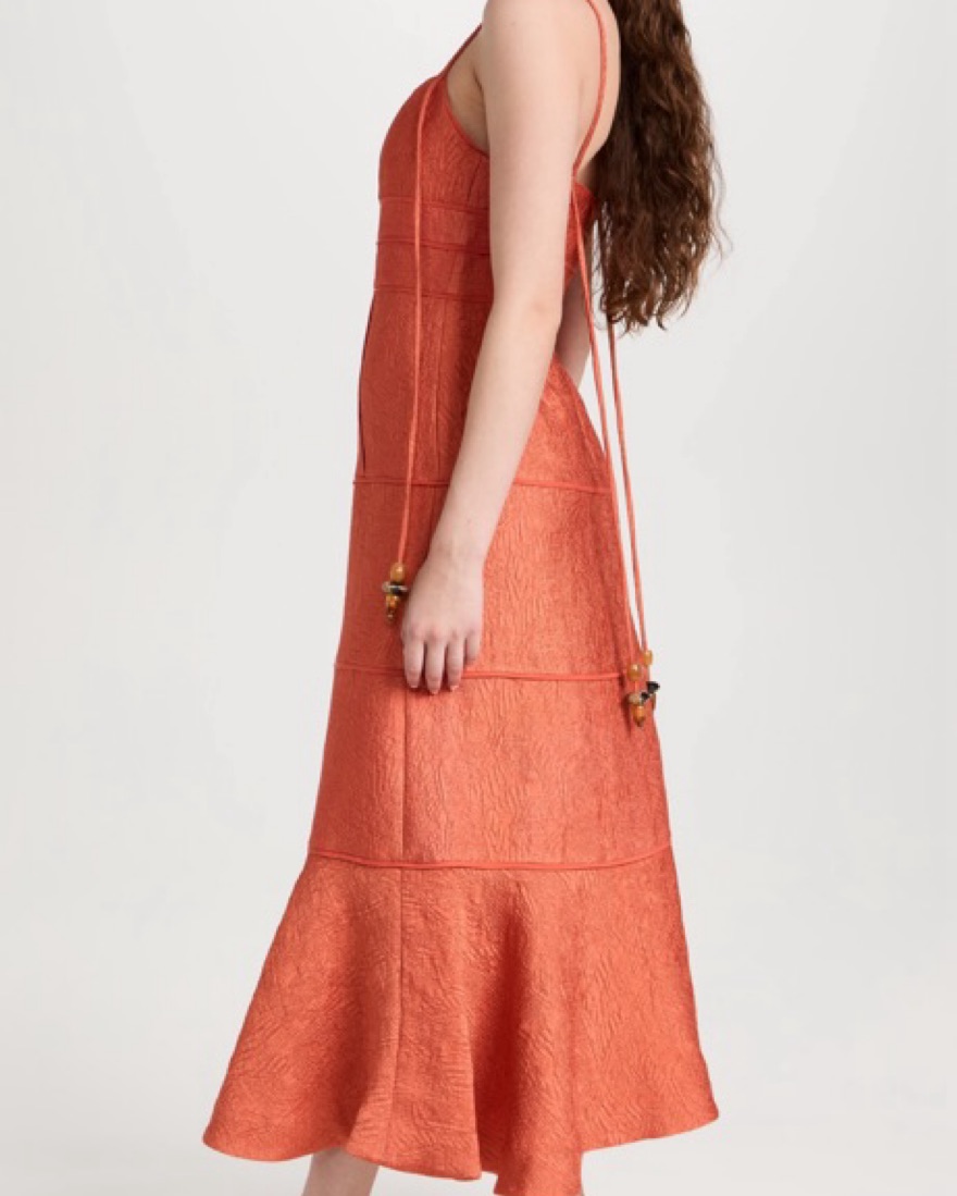 Mid-weight, stretch brocade fabric in terracotta / burnt orange. Super comfy flounce skirt with a lined bodice but unlined skirt. Size XS but would fit a small.