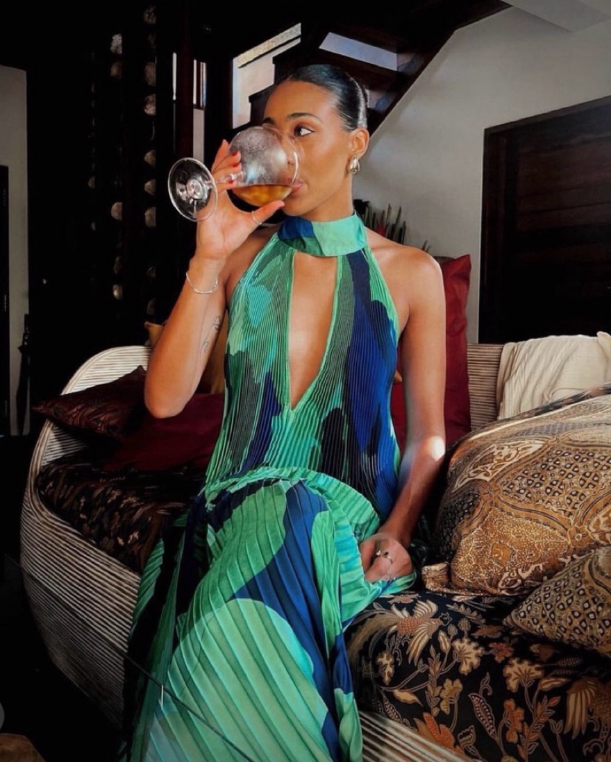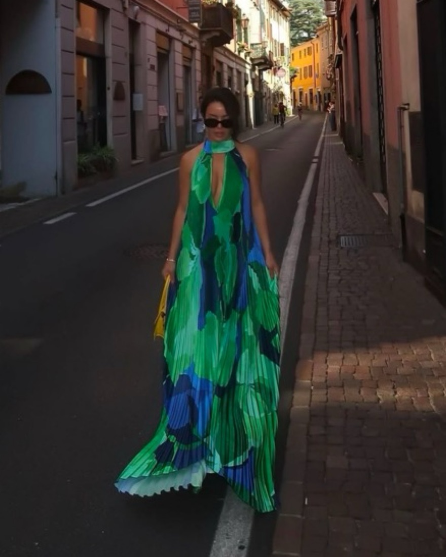 Featuring a high neckline, tie back halter and asymmetrical silhouette, this stunning billowing pleat full-length dress will transform you for an evening to remember.