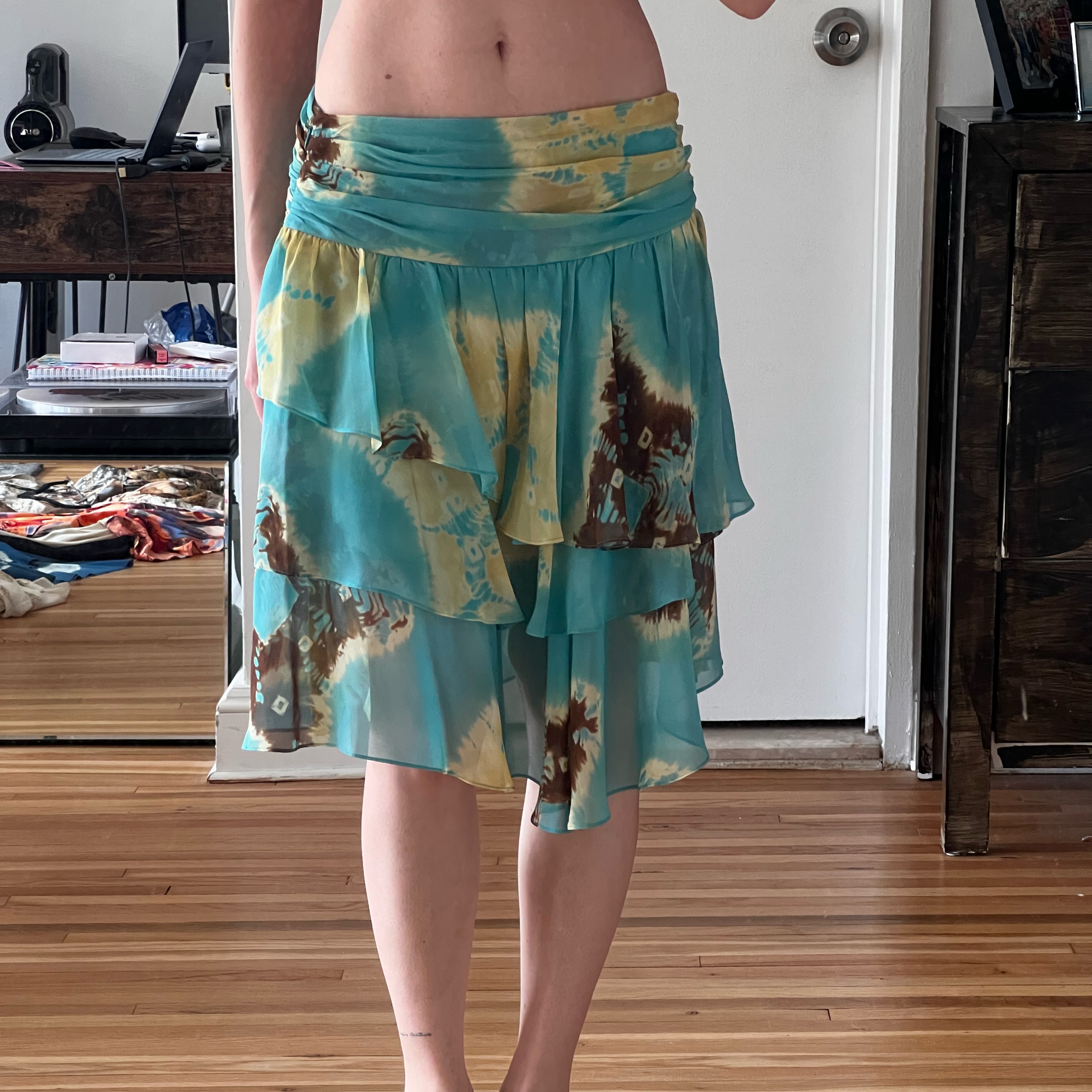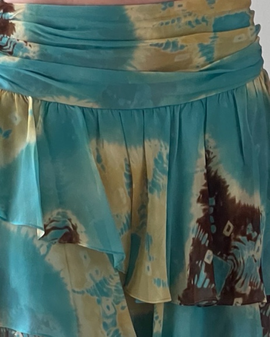 Vintage Anne Klein ruffle midi skirt. Turquoise with brown and green/yellow.
