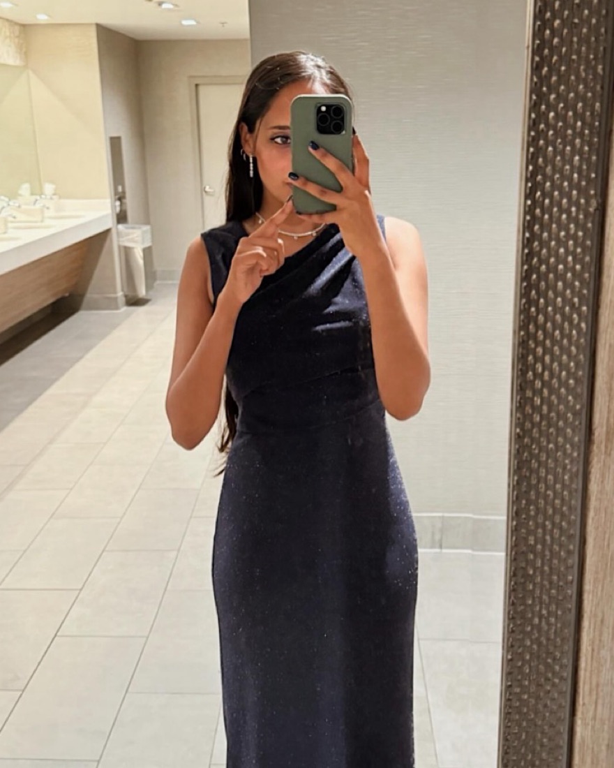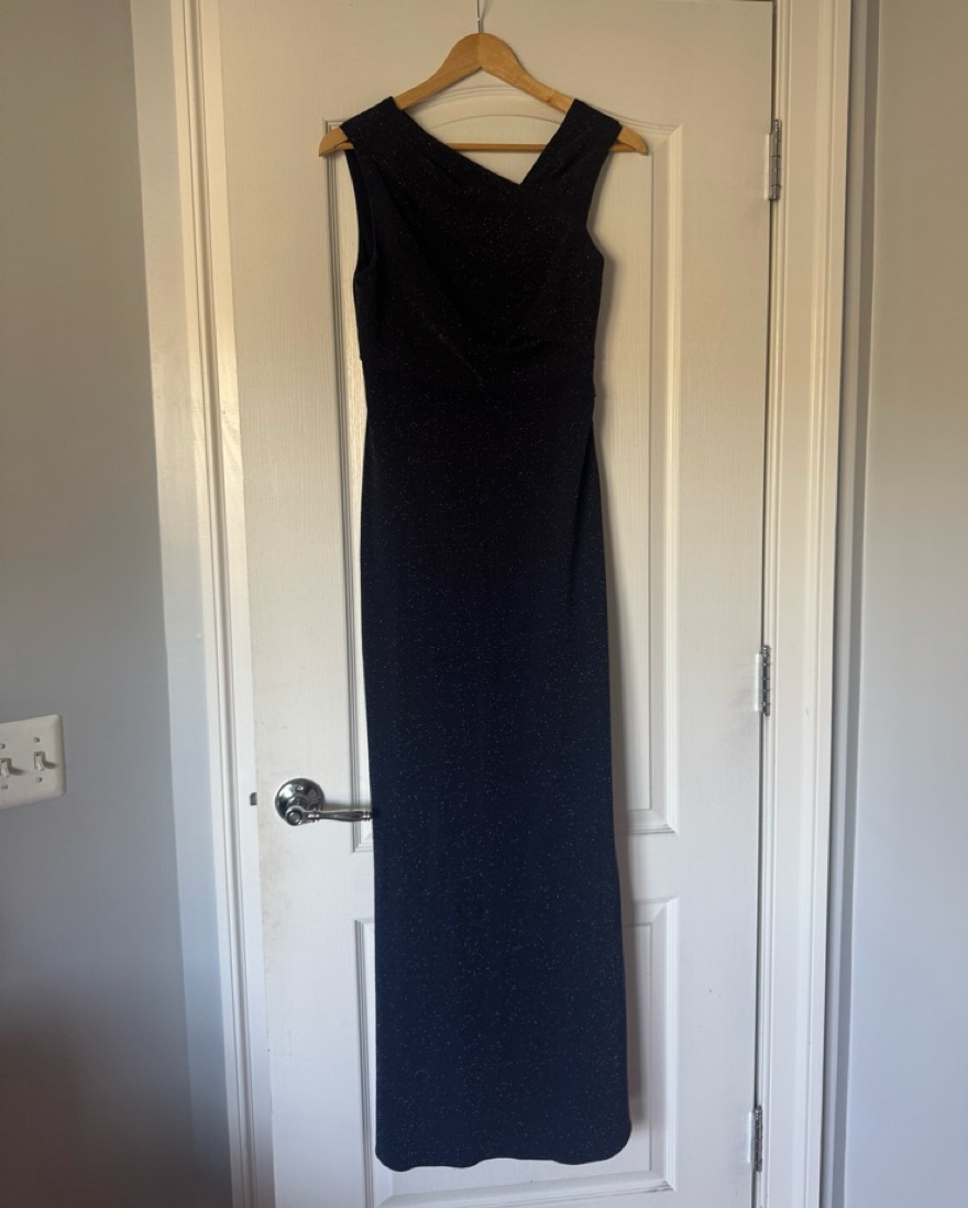 This stunning navy blue Adrianna Papell gown is perfect for a formal event or special occasion. The sleek, figure-flattering silhouette and luxurious velvet fabric create an elegant and sophisticated look. Size 2, worn once!