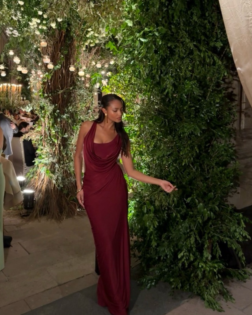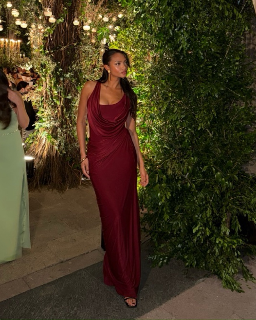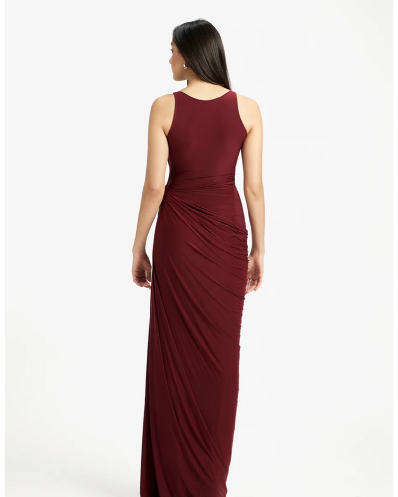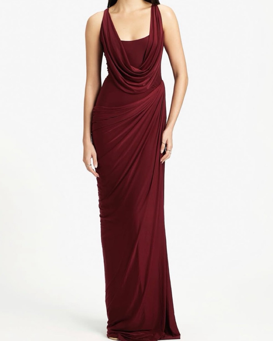 This stunning crimson gown exudes elegance and sophistication. The draped cowl neckline and figure-flattering silhouette make it an ideal choice for formal events.