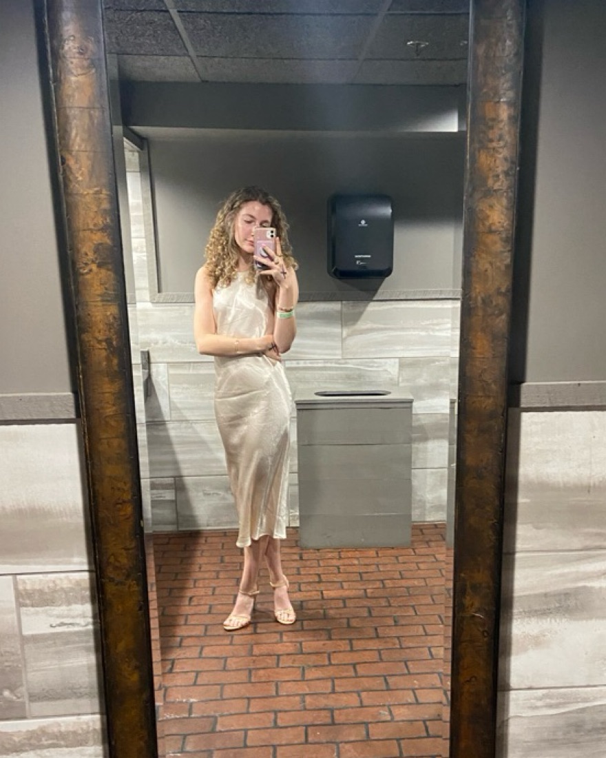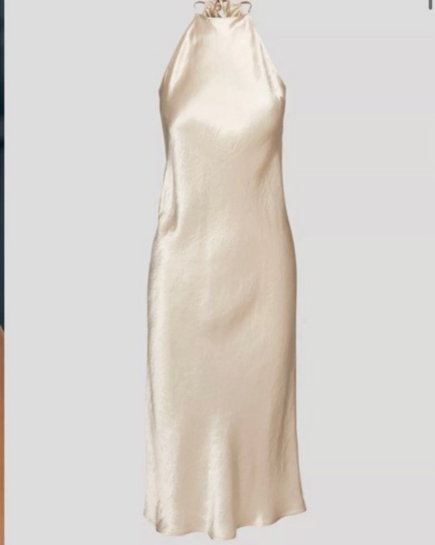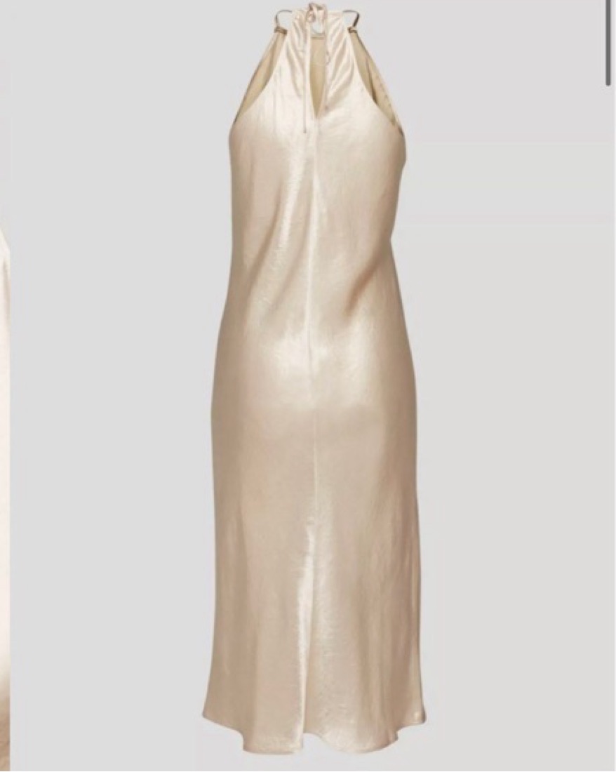 Silky champagne colored midi dress, love it for formals/weddings/nice dinner. Back tie closure, fits a xs/s! Pretty please dry clean if stained :)