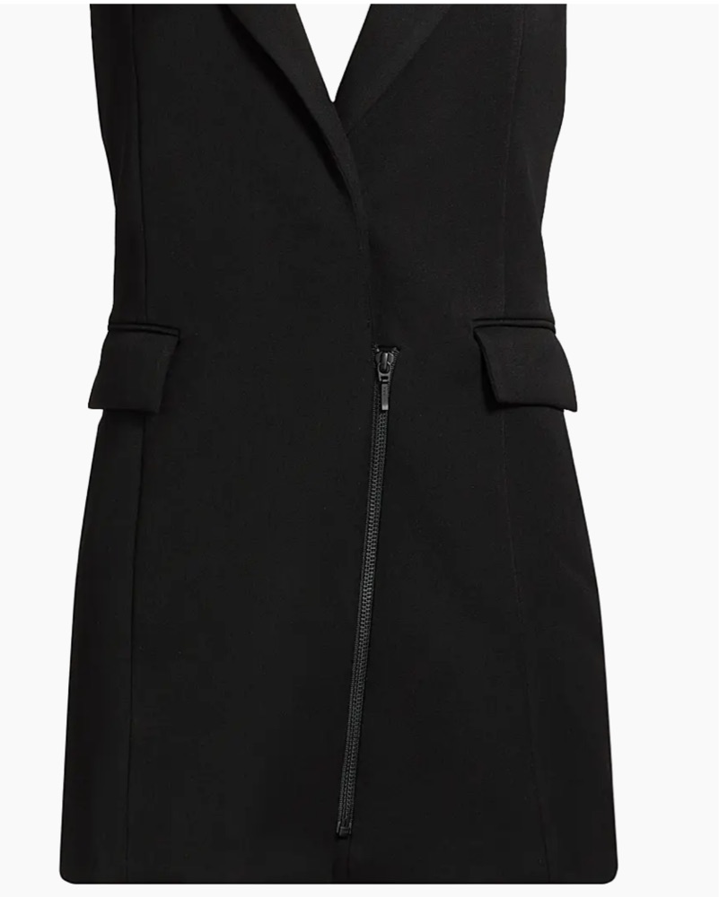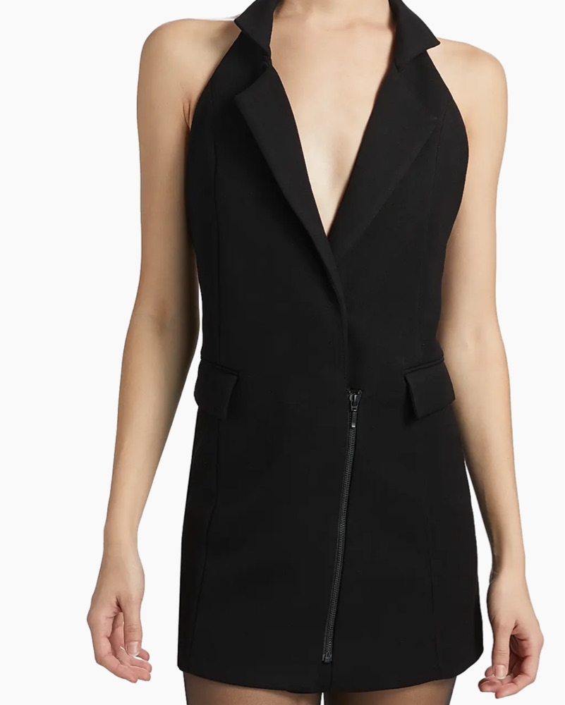 This sleeveless blazer black mini dress is perfect for a night out on the town. The halter neckline and open back add a touch of allure, while the zipper detail adds a modern edge.