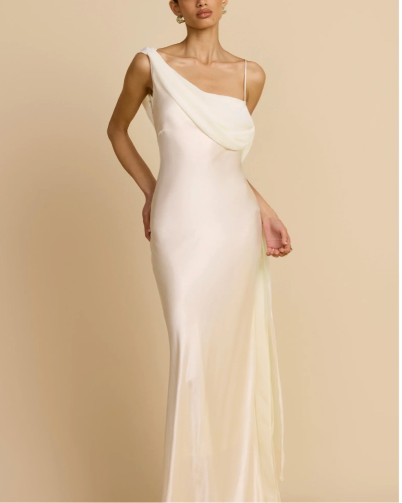 Beautiful dress with asymmetric neckline and a low back. Length has been altered (I’m 5’4 and when I wear 1 inch heels it skims the floor) but the straps are adjustable so you can adjust the length.