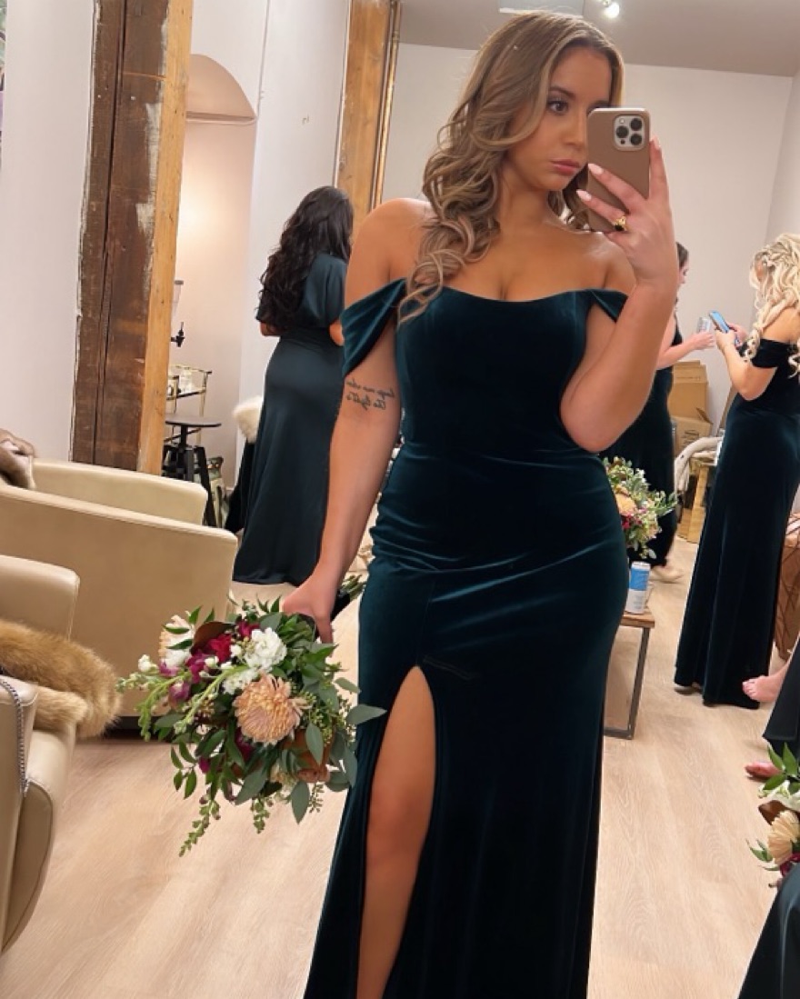 Worn as a bridesmaids dress. Altered length for 5’5’’ height. Im 5’2’’ and wore 3 inch heels.