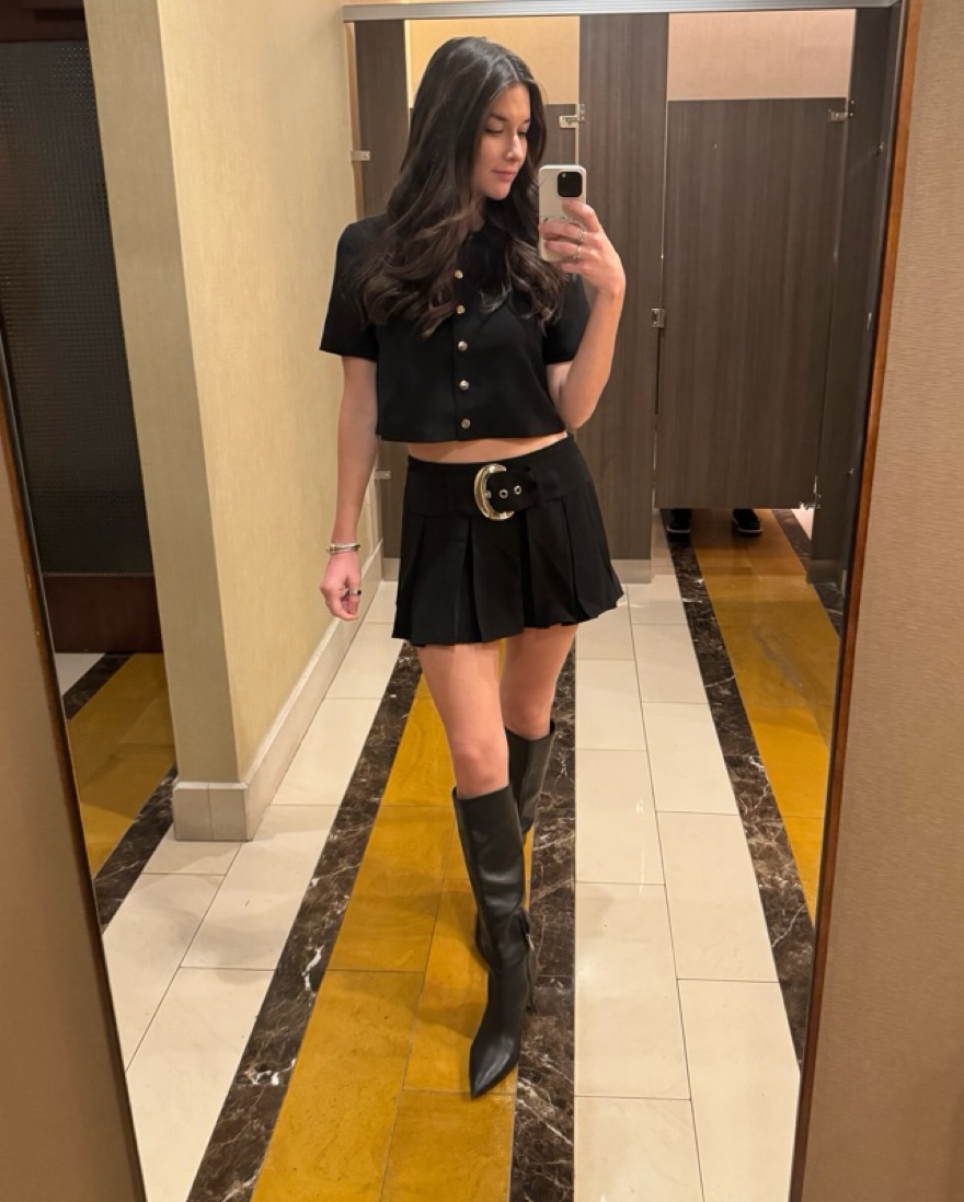 Black “Josie” shirt and skort set, so flattering and chic! One of my favorite outfits that can be dressed up or down. Please note - the top is size small and skirt is size medium! **Price includes dry cleaning. Please be very careful of this item!