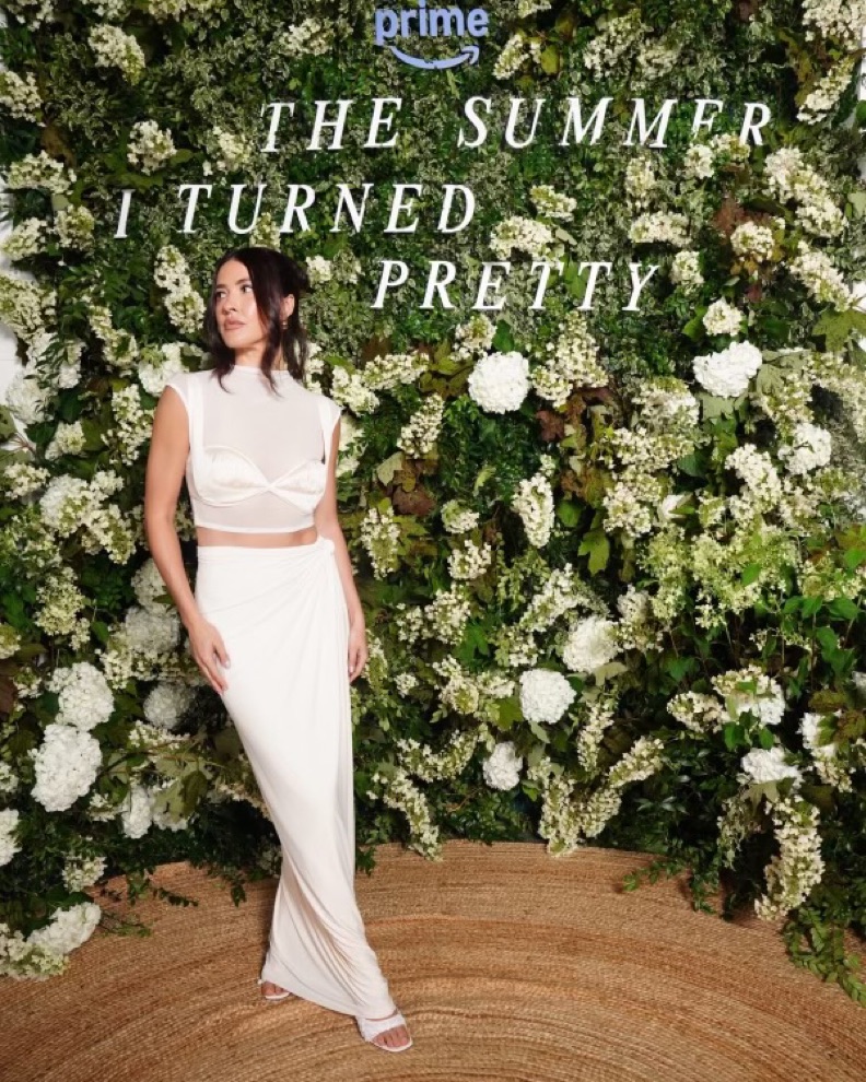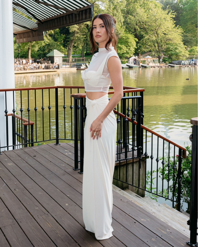 Absolutely stunning 3 piece skirt and top set from Deme by Gabriella. Color is off white. Top is a capped sleeve mesh crop top with detachable silk bralette. Bralette runs a bit loose in shoulder for a size small. Skirt is maxi length with knotted waistband. Super stretchy and comfortable.