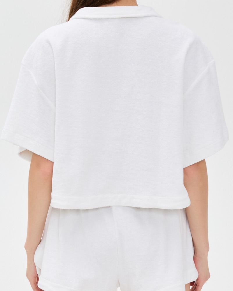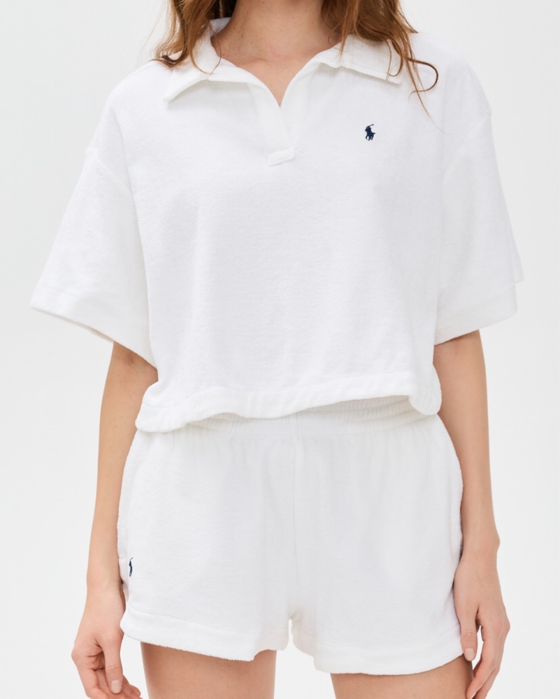 A stylish and relaxed white polo shirt and shorts set perfect for a casual summer day.