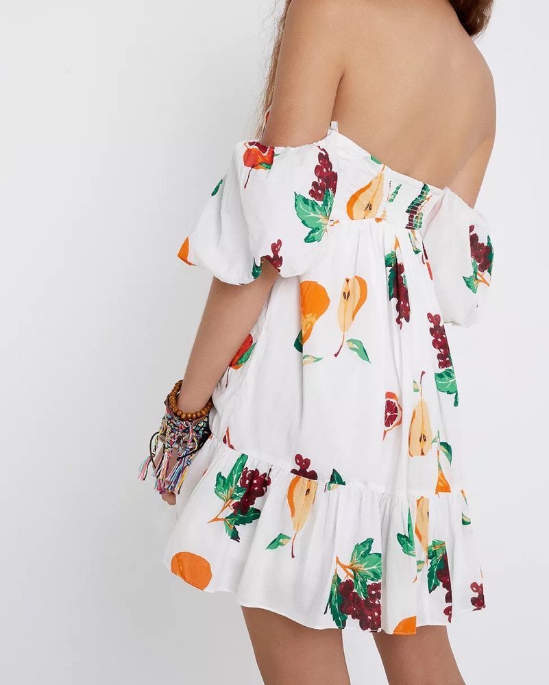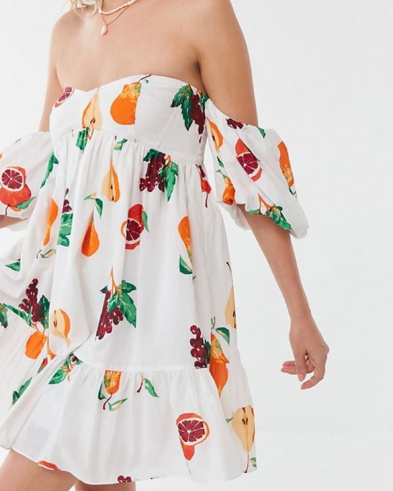 Puff Sleeve Babydoll Fruit Print Dress by Urban Outfitters - Pickle