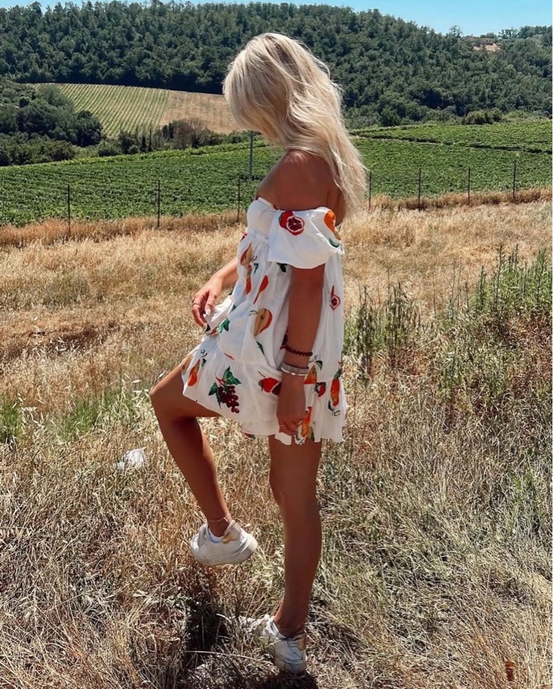 The sweetest dress quite literally the fruit print is adorable and it’s so comfortable. Perfect for brunch, travel, picnics, dates or anything!!