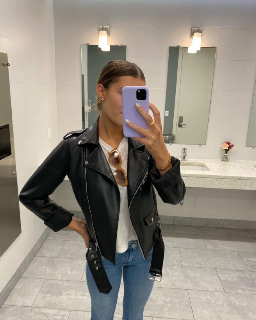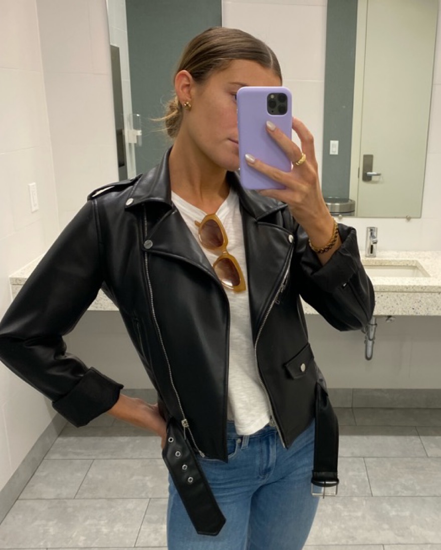 The best staple leather jacket that goes with everything ! Fits perfect over a tee , light sweater or dress ! (sleeves are rolled in this pic )