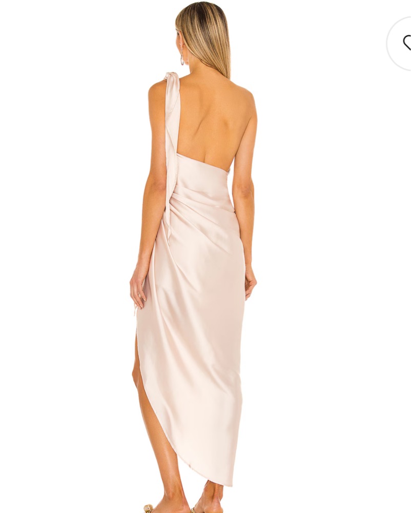 This blush pink one-shoulder knotted dress can be worn at a cocktail party, lunch, or beach party . The draped, asymmetric silhouette and thigh-high slit create a captivating look.