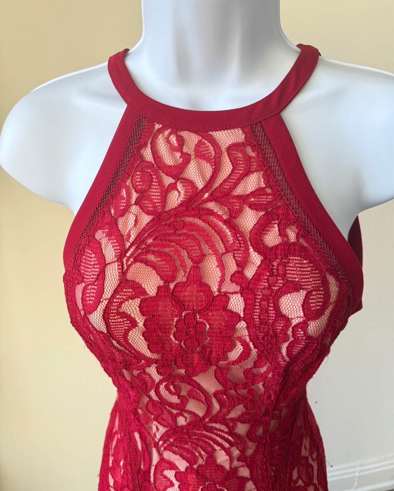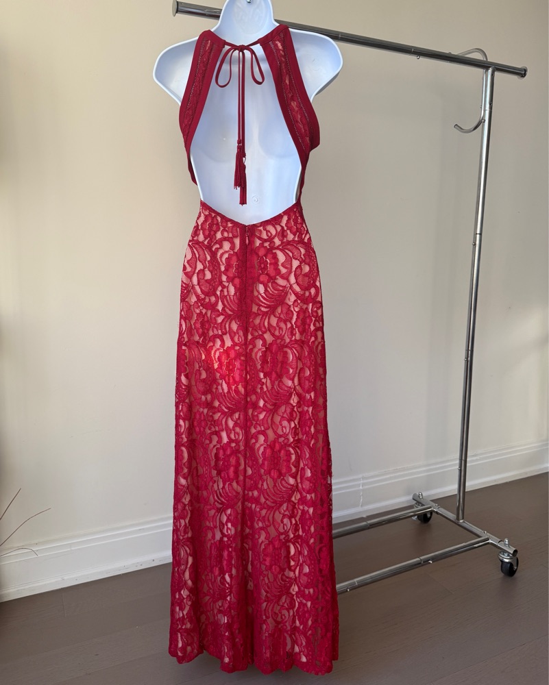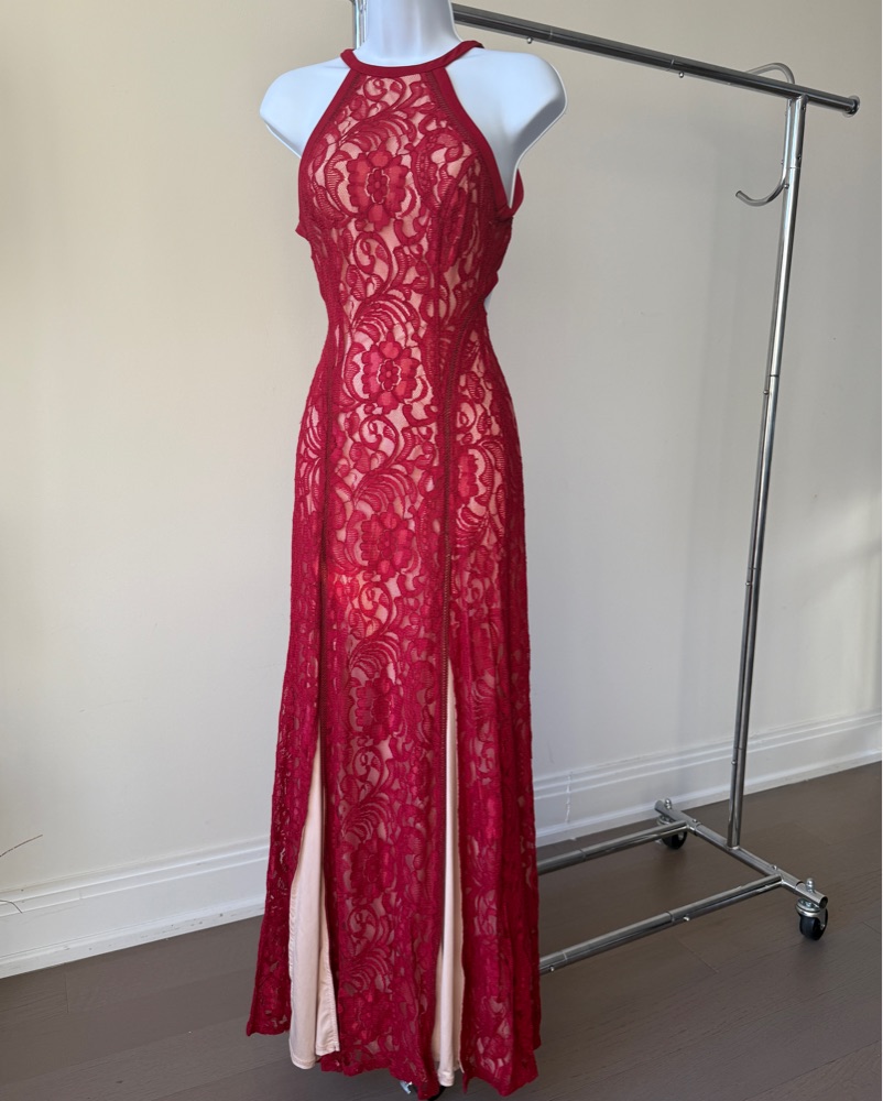 Stunning red lace dress with cream liner. Halter neck with back neck toes, sensual low back, and front thigh high slits on each leg. Love it for weddings, black tie, formal, parties, birthday, fancy shows. Label tag is missing. Please return as received.
