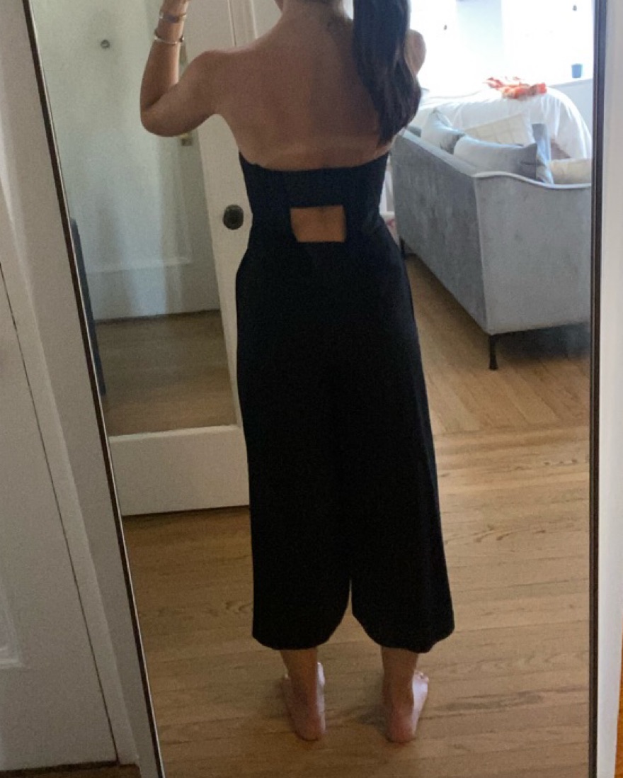 Worn once. Jumpsuit is wide legged with pockets and a cutout in the back. Side zipper