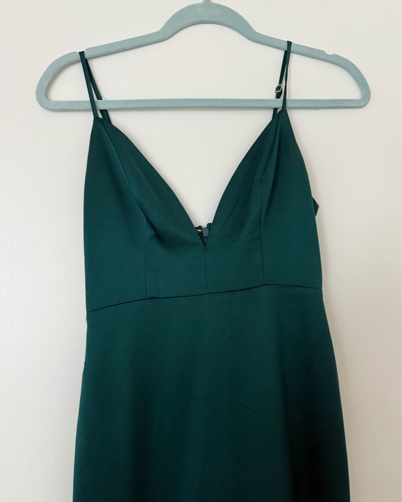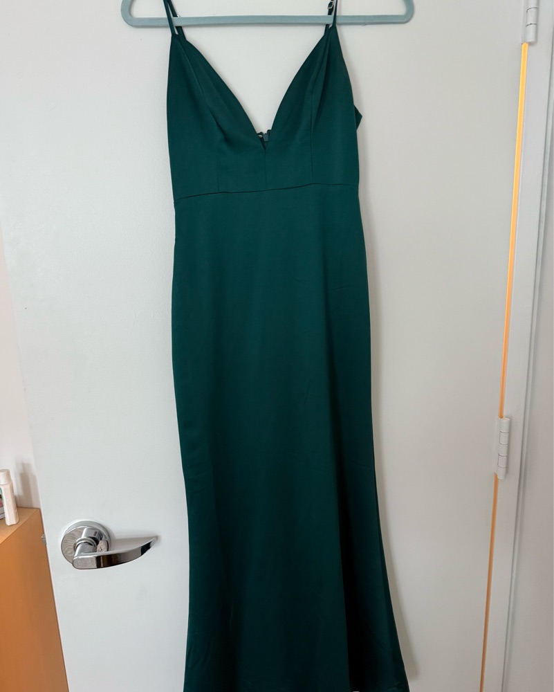 Satin material, emerald color, formal dress perfect for a formal or black tie wedding. Only worn once!