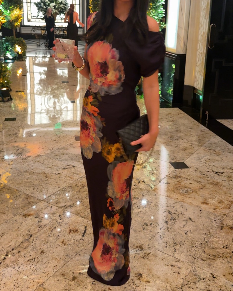 This stunning dress features a floral print and a stylish cold-shoulder design, perfect for making a statement at any formal event or special occasion.