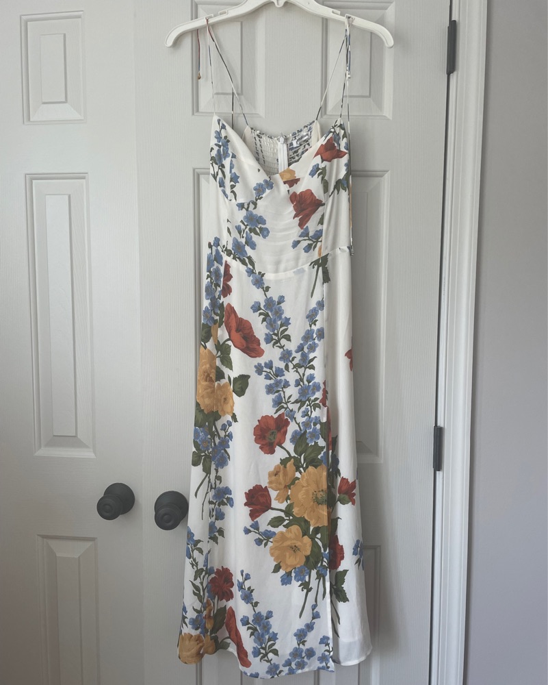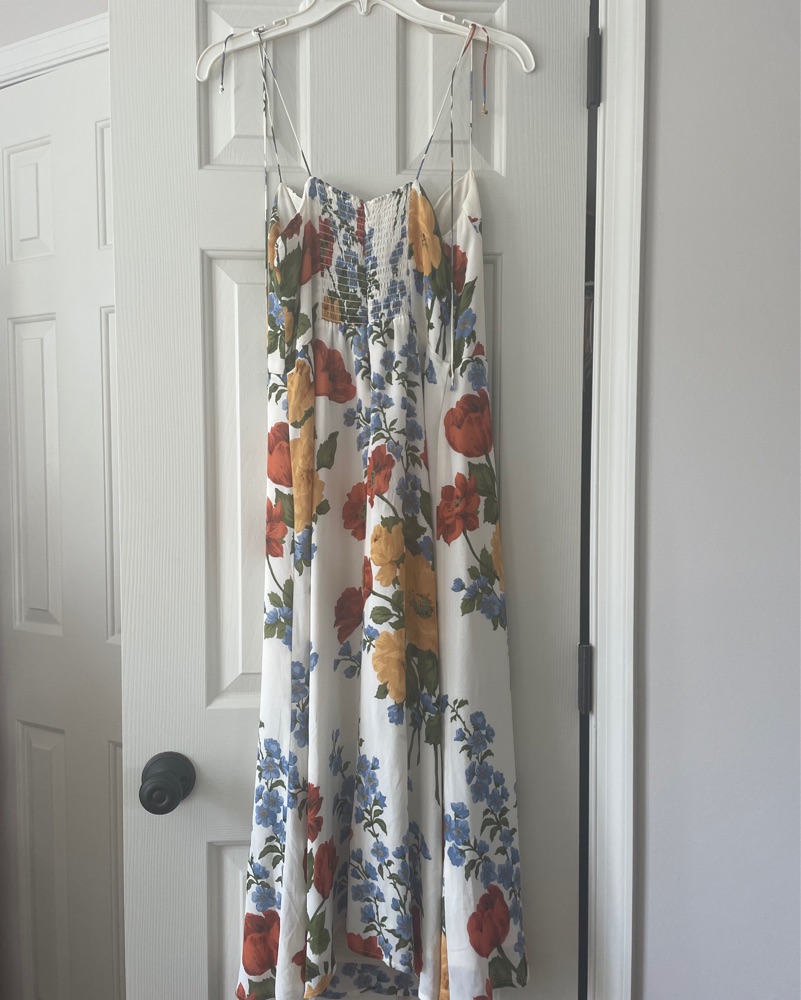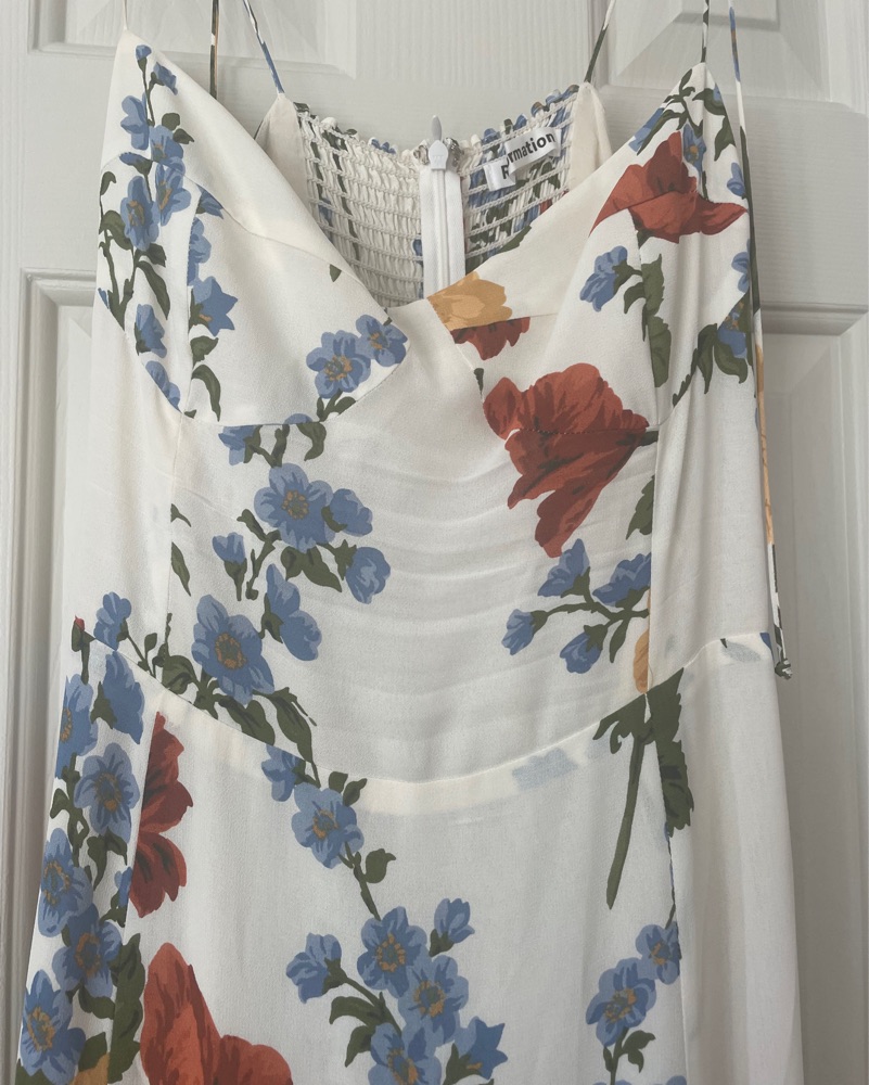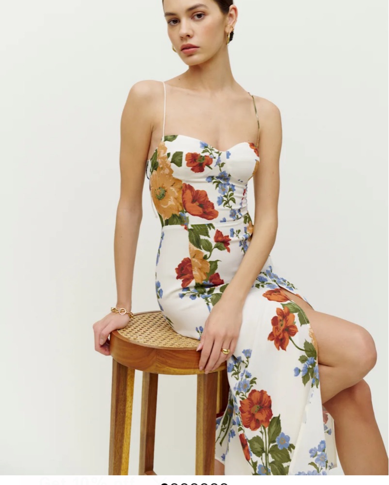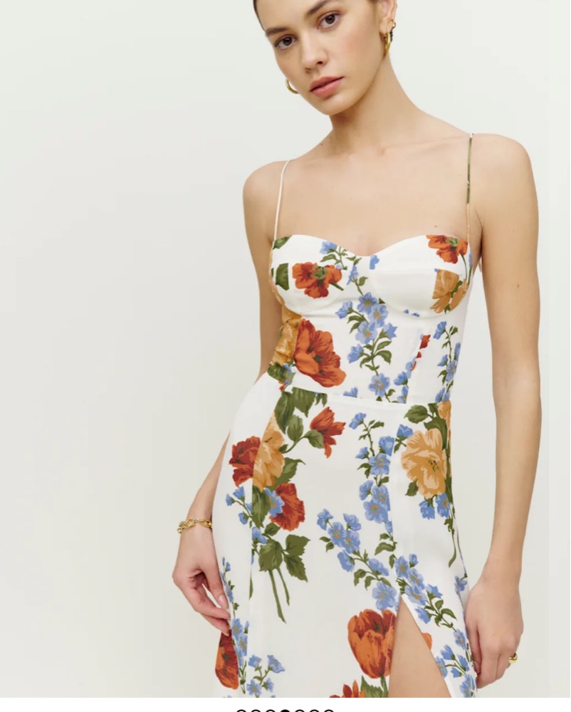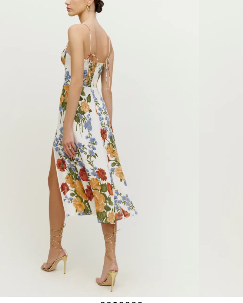 Juliette features a sweetheart neckline atop a corset-style bodice. Flowing into a relaxed skirt with a sky-high slit, the occasion-ready number is finished with delicate spaghetti straps and a smocked back bodice