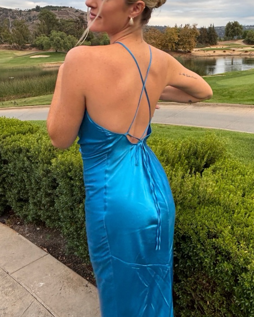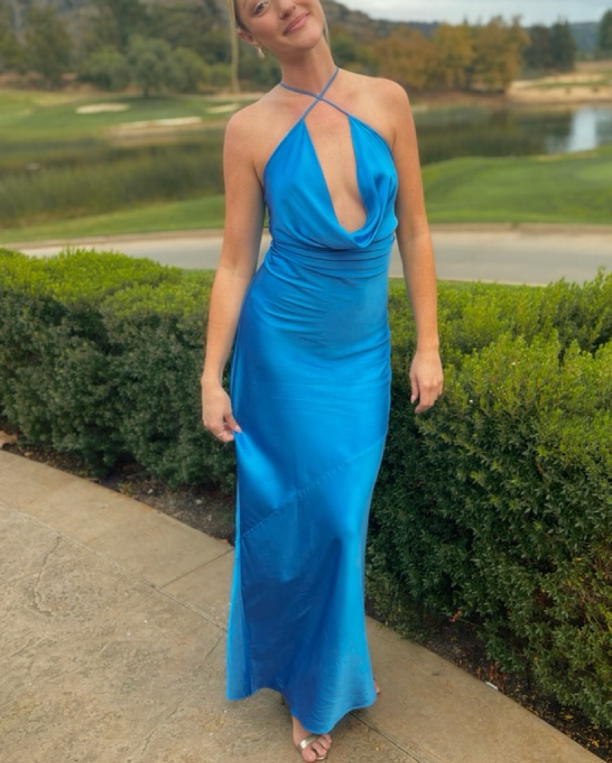 Satin cross cross chest w/ drape front maxi dress size small (I am 5’9 in photo)