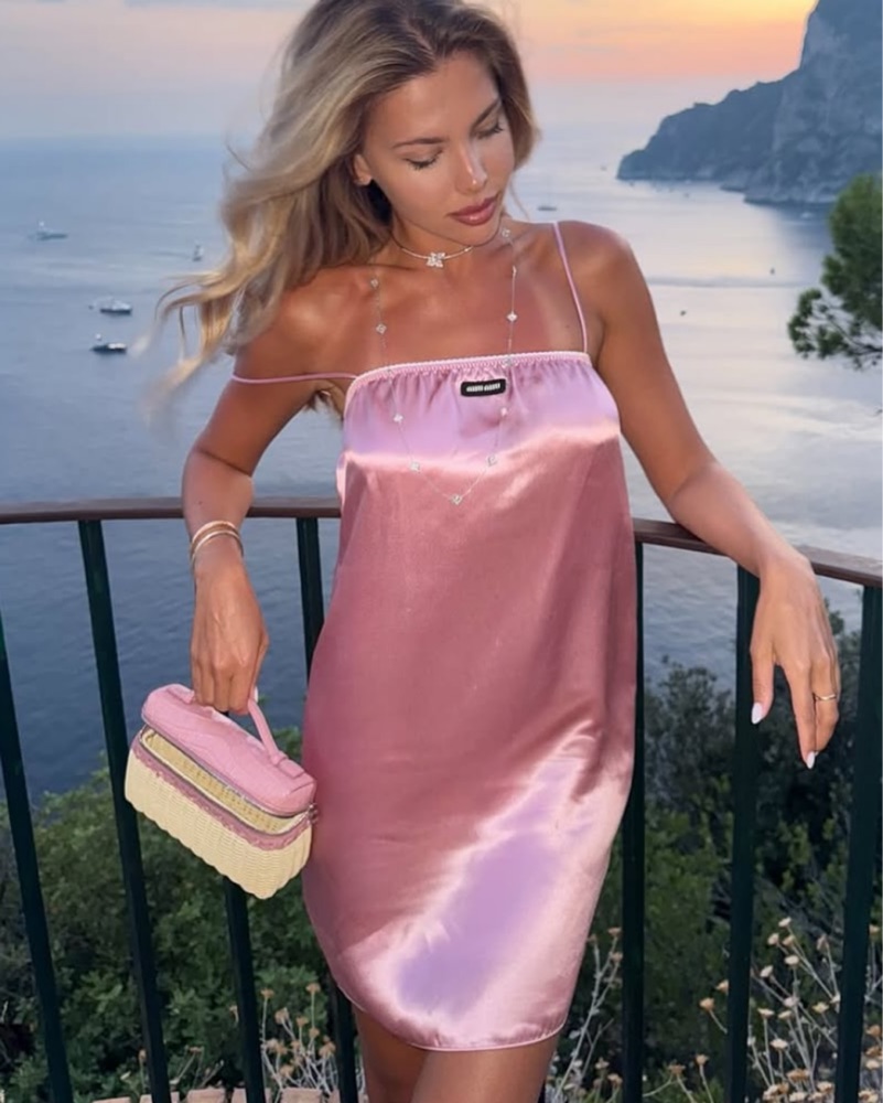 This gorgeous satin slip dress is perfect for a chic evening out. The luxurious fabric and minimalist design create a timeless, sophisticated look.